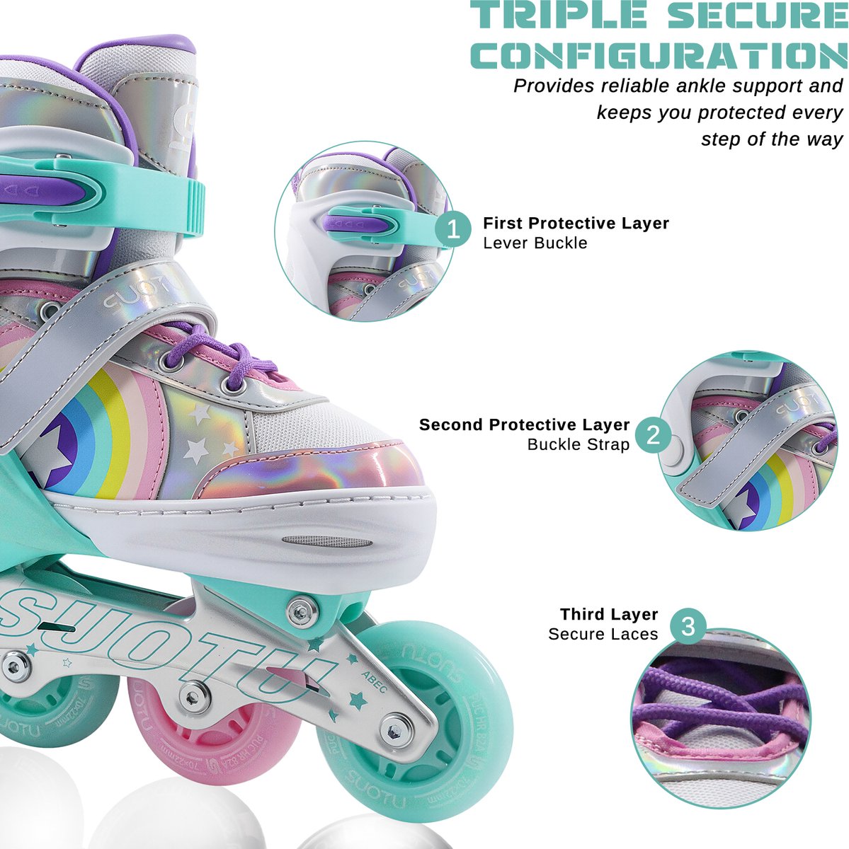 De SUOTU inline skates zijn verstelbare rolschaatsen speciaal ontworpen voor kinderen die leren skaten of snel groeien. Ze combineren een lichtgewicht, geïntegreerd frame met zelfgenererende lichtjes in de wielen en een eenvoudig verstelmechanisme, zodat één paar meerdere seizoenen mee kan gaan.