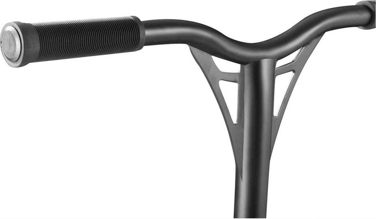 Het stuur (T‑bar) is van staal en 470 mm breed, matzwart afgewerkt. Let op: de hoogte van het stuur is niet verstelbaar — dat maakt de step compact en stijf, maar minder flexibel als je meerdere rijders van verschillende lengte wilt laten wisselen. De handvatten zijn van rubber met stootbescherming aan de uiteinden en een geribbeld oppervlak voor grip.