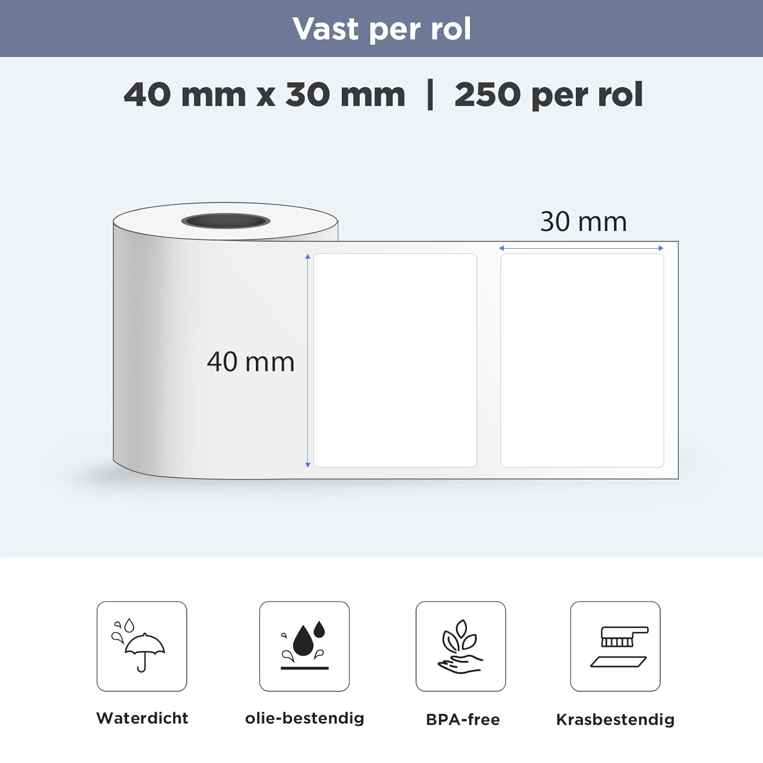 Compacte, duurzame etikettenrol geschikt voor SUPVAN label printer en ideaal voor Nederlandse huishoudens en kantoren. Elke rol bevat 250 etiketten van 40 mm x 30 mm, waterbestendig en geschikt voor thermische printers.