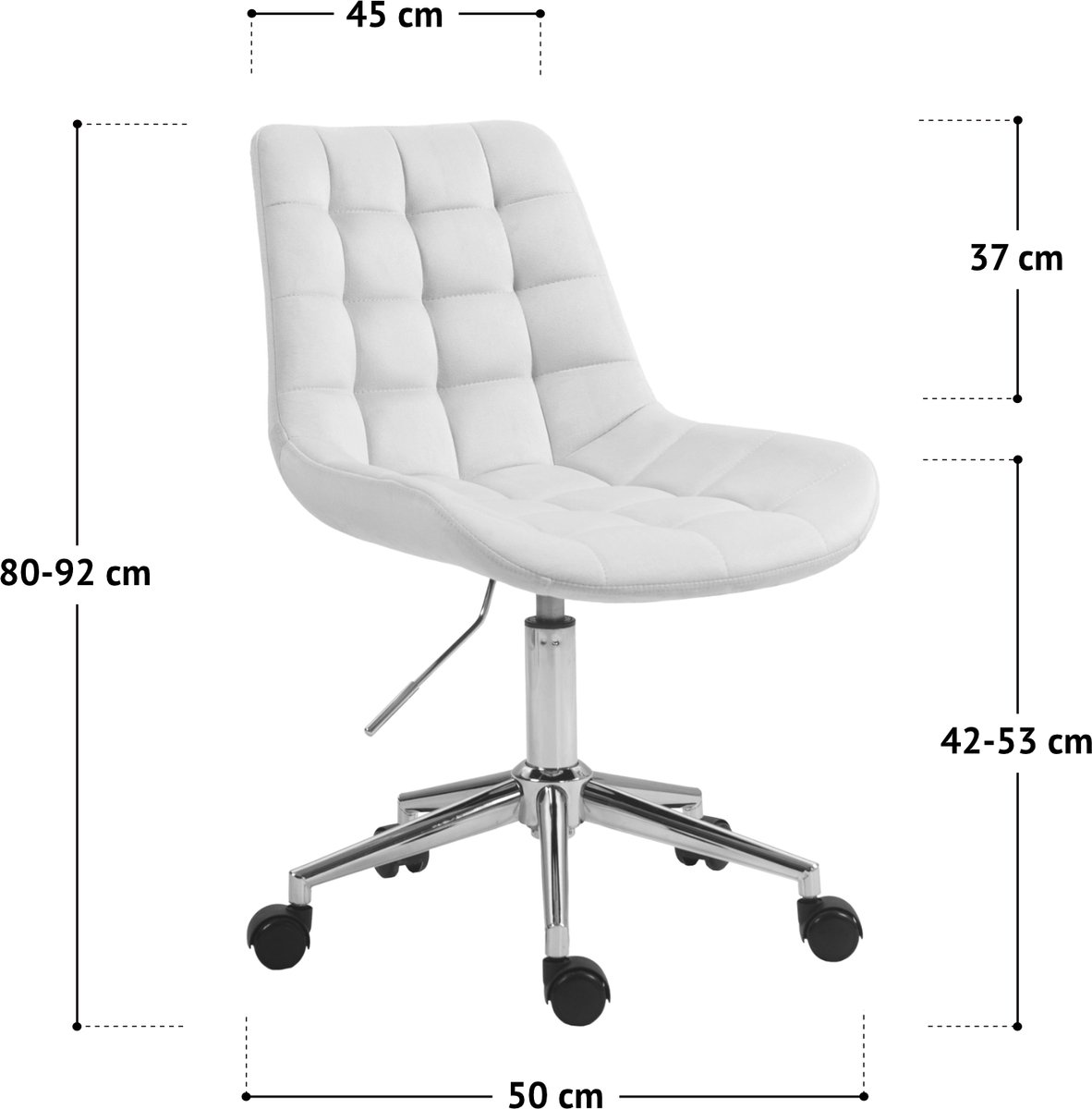 De totale afmetingen zijn ca. 50 x 54 x 80–92 cm (B x D x H) en het gewicht is ongeveer 6,7 kg (source: listing, checked 2025). Door het lichte gewicht is de stoel eenvoudig te verplaatsen, maar houd er rekening mee dat lichtere constructies soms minder massief ogen dan zwaardere bureaustoelen. De basis heeft geruisloze wielen en een 360° draaimechanisme, wat soepel bewegen rond het bureau mogelijk maakt zonder de vloer te beschadigen.