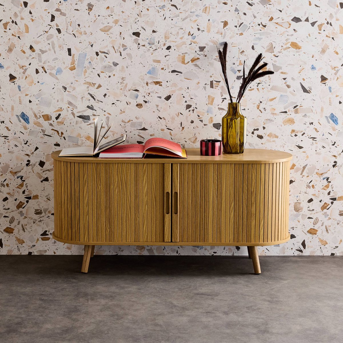 Ergonomie en gebruiksgemak zijn zichtbaar in de schuifdeuren: ze nemen geen extra ruimte in beslag bij openen en sluiten soepel — handig in kleinere kamers of bij plaatsen tegen een muur of achter bank. De kompaspoten dragen bij aan de Scandinavische uitstraling en geven het meubel visuele luchtigheid.