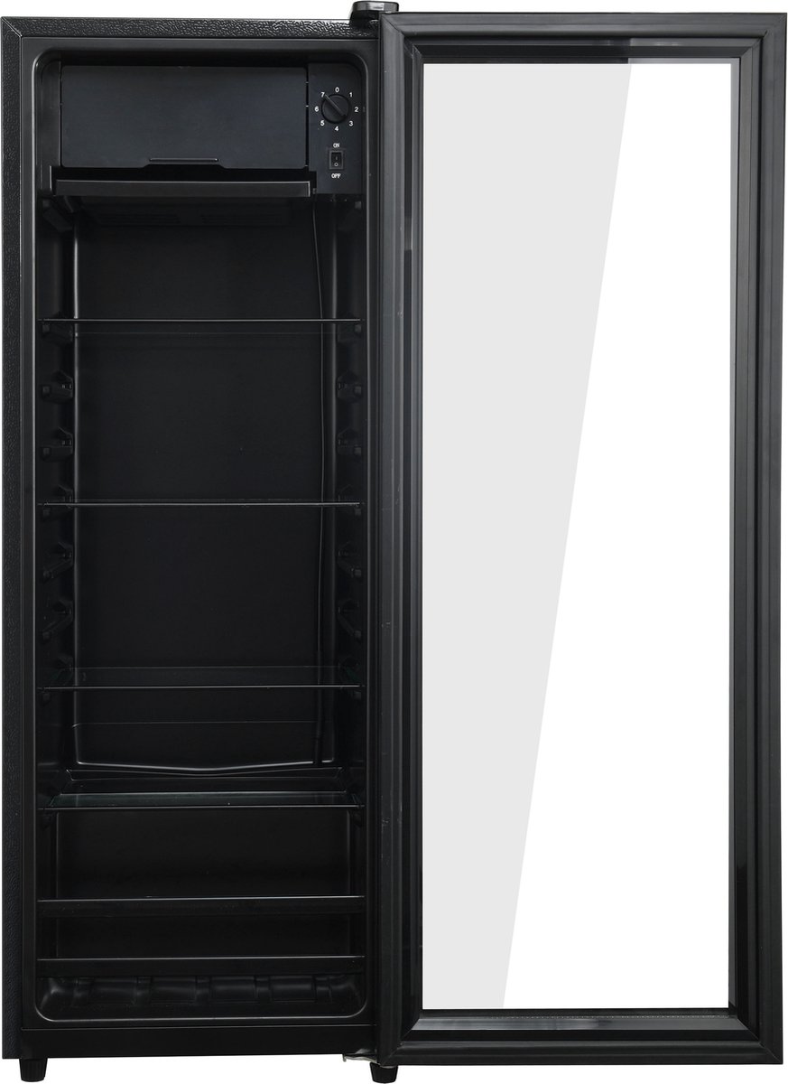 - Vrijstaande koelkast met glazen deur (zwart, 120 L koeler + 8 L vriezer; bron: listing, gecheckt 2025)