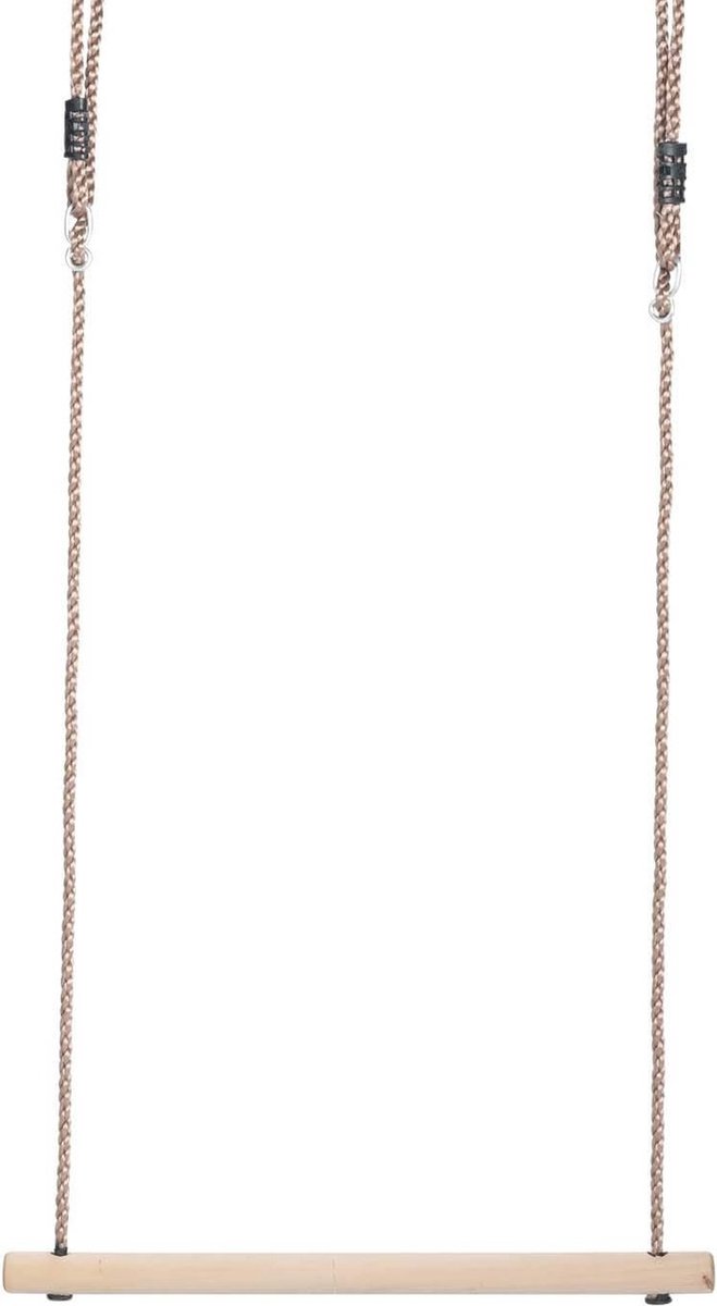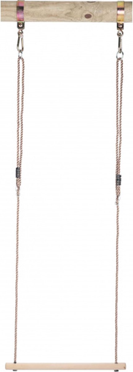 Het houten zitje geeft de trapeze een klassieke, robuuste uitstraling. Hout voelt warmer aan dan kunststof en krijgt snel een natuurlijke, tijdloze uitstraling in de tuin. In de praktijk betekent dat: minder koude voeten in herfst en winter en een solide zitvlak voor speeltoestellen in huis of buiten.