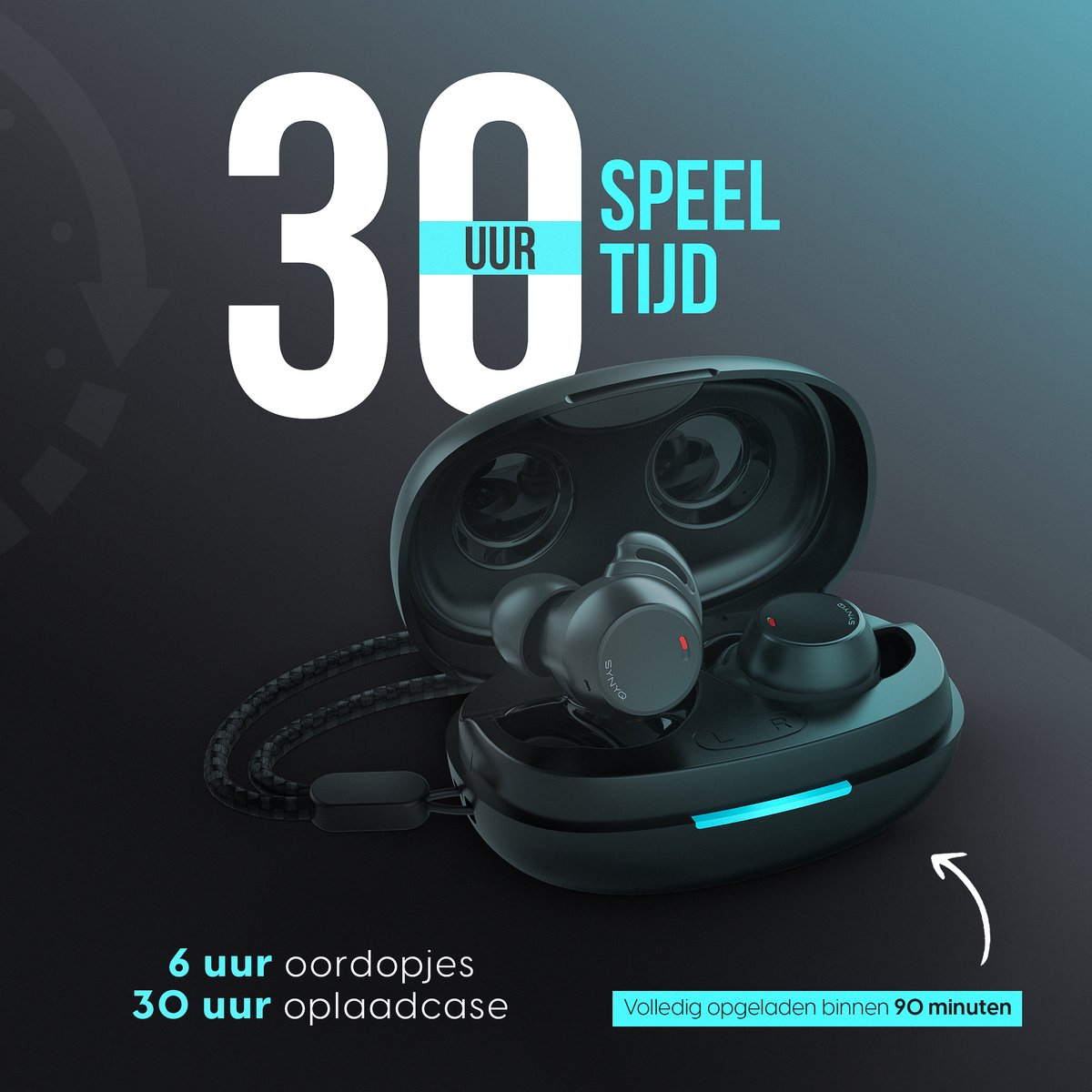 Overzicht:De Synyq Aria Buds zijn draadloze oordopjes die Nederlandse sporters en actieve gebruikers ondersteunen met betrouwbare prestaties. Met maximaal 30 uur afspeeltijd blijf je de hele dag luisteren zonder opladen.