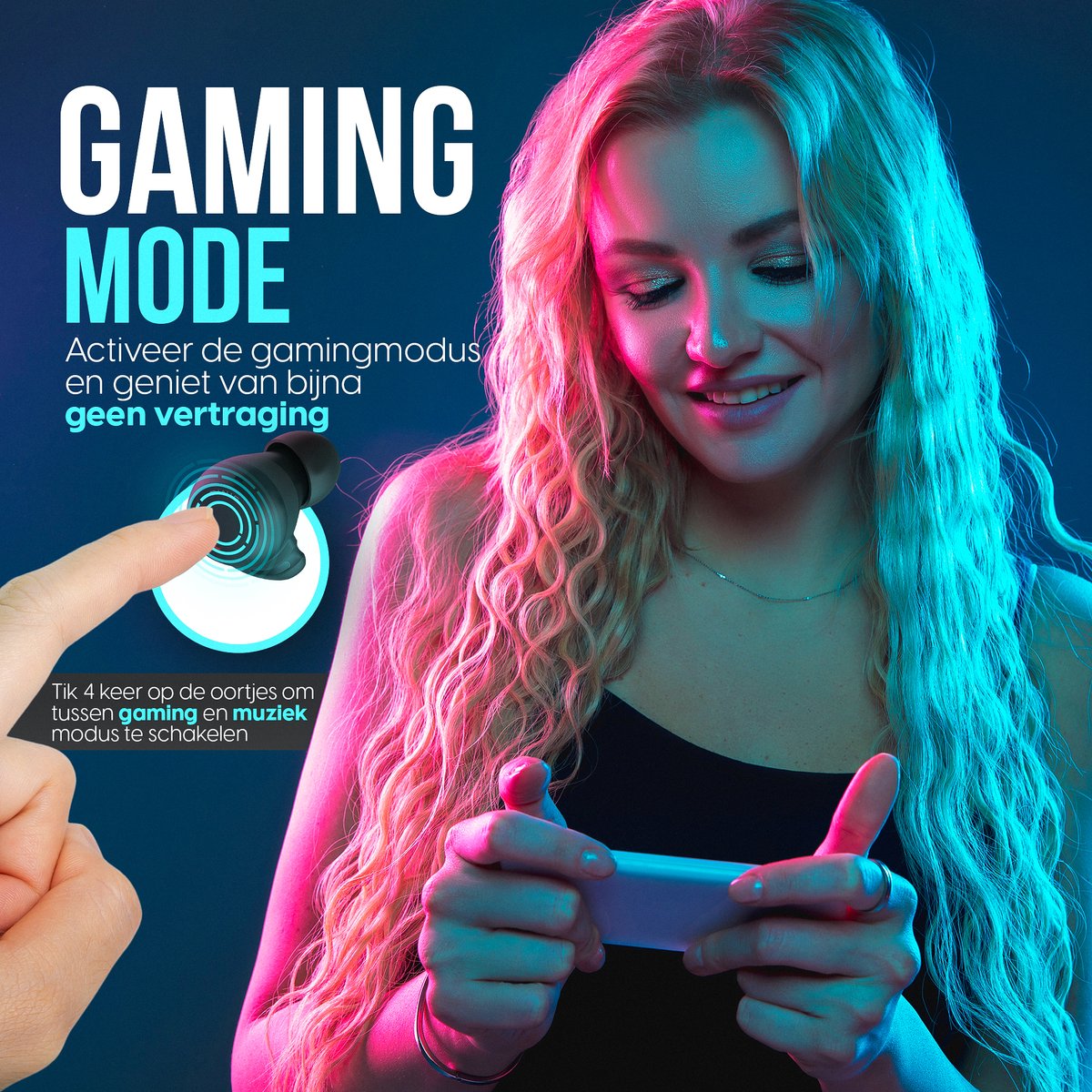 Er is een speciale gaming modus die de latentie verlaagt voor spellen en video. Volgens de listing activeer je deze modus door vier keer op het oortje te tikken. In gebruik betekent dit een betere synchronisatie tussen beeld en geluid bij mobiele games en video’s.