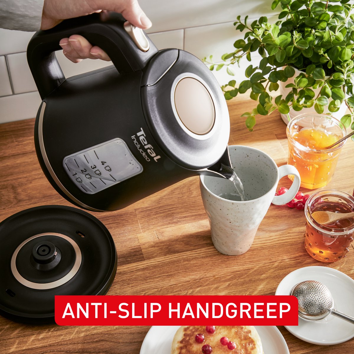 De Tefal Includeo KI5338 is ontworpen met gebruiksgemak als uitgangspunt. De vorm is rond en vriendelijk, zonder scherpe randen of kleine, lastige bedieningselementen. De behuizing en afwerking ogen stevig en geschikt voor dagelijks gebruik, terwijl de waterkoker volgens de fabrikant een “comfortabel” gewicht heeft. Dat is prettig als je hem vaak vult of regelmatig kleine hoeveelheden water kookt.