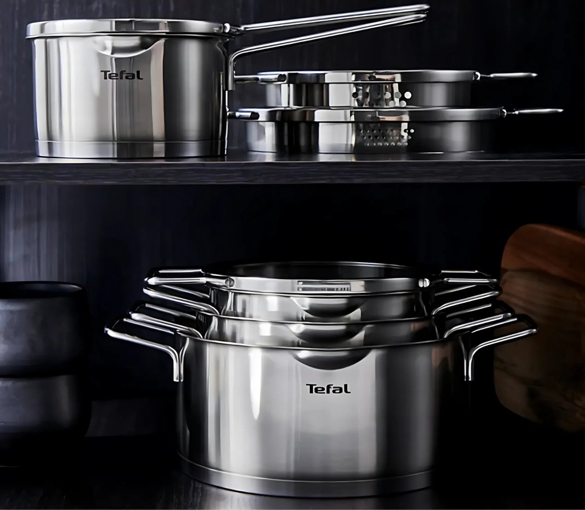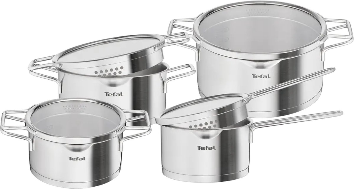 De Tefal Nordica Pannenset is een 8-delige set roestvrijstalen pannen met platte glazen deksels, ontworpen voor dagelijks gebruik op alle warmtebronnen, inclusief inductie. De set combineert een minimalistisch, Scandinavisch geïnspireerd uiterlijk met praktische details zoals dubbele handgrepen die het afgieten vergemakkelijken.