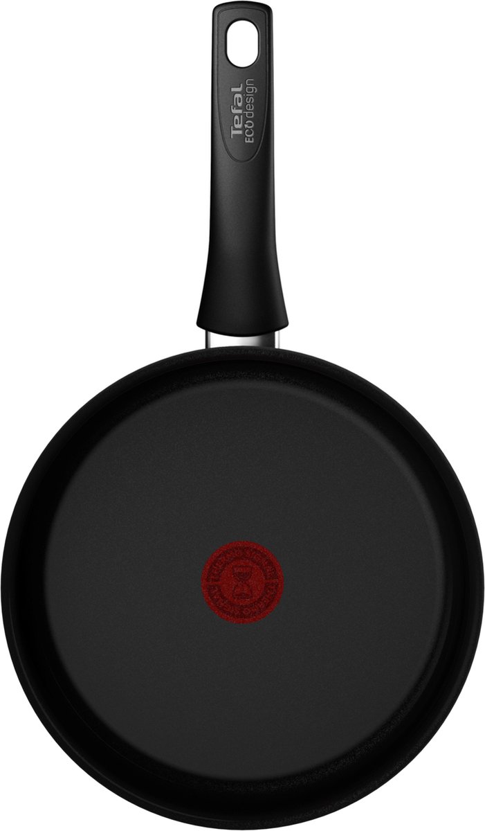 De Tefal Renew Black On Keramische Hapjespan oogt strak en modern, met een zwarte buitenkant en een stevige handgreep die stabiel in de hand ligt. De kern van de pan is vervaardigd uit 100% gerecycled aluminium. Dit materiaal is licht genoeg voor wendbaarheid aan het fornuis en tegelijkertijd stevig genoeg voor dagelijks gebruik. Aluminium staat bekend om zijn gelijkmatige warmteverdeling, wat in een 24 cm pan zorgt voor egale garing, ook aan de randen.