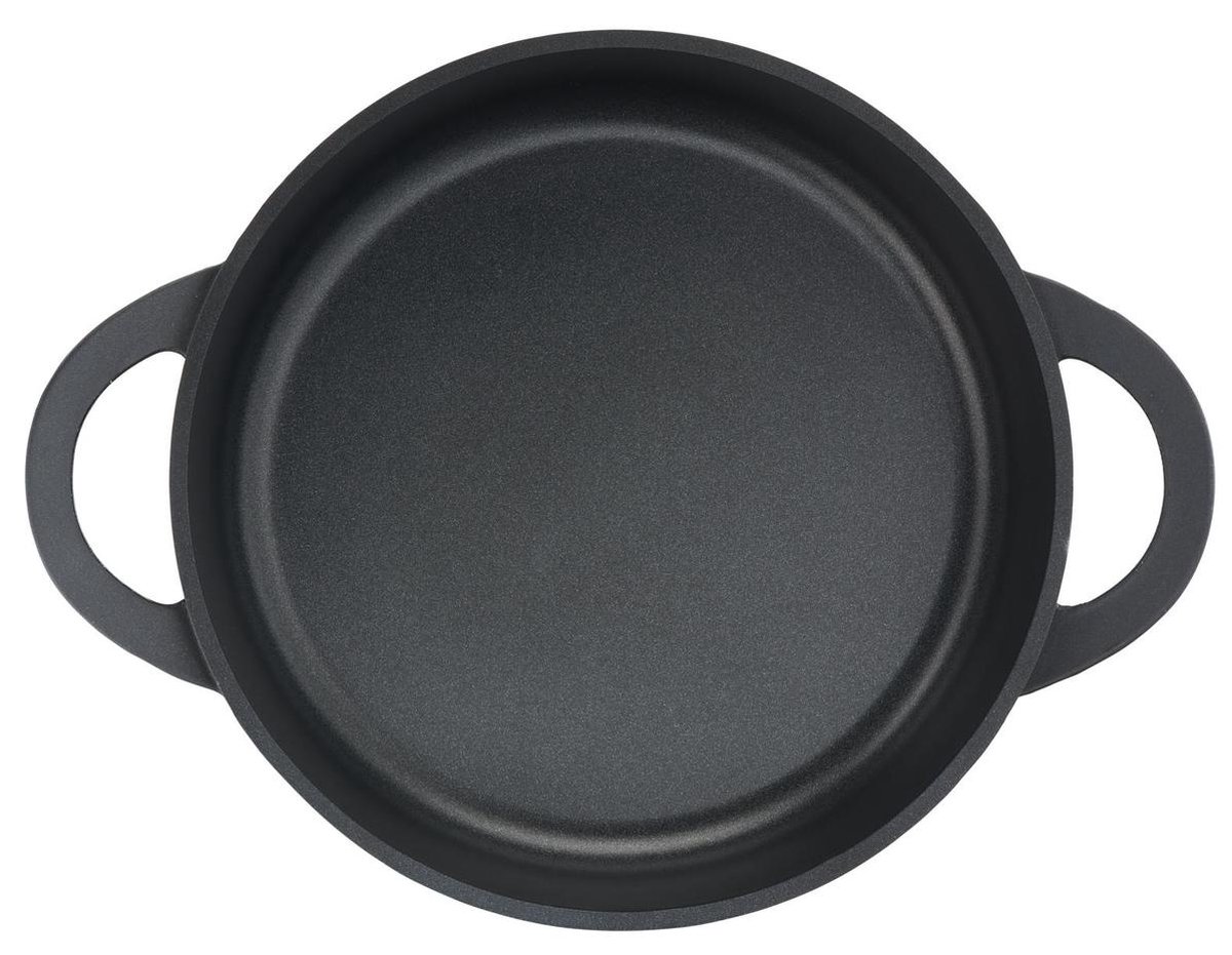 Wat het doet: het meegeleverde deksel sluit warmte en vocht in, ideaal om te stoven of sudderen. Doordat het uit gegoten aluminium is, kan het ook hoge oventemperaturen aan.