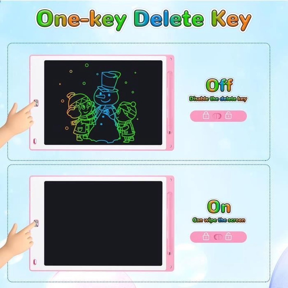 Het uitwisbare LCD tekenbord wist het volledige scherm met één druk op de ingebouwde wis-knop. Dat maakt het snel om opnieuw te beginnen en voorkomt dat je papier moet scheuren of in de prullenbak moet gooien. In de praktijk is dit handig tijdens oefensessies: een kind schrijft een letter, krijgt direct feedback en kan meteen overschrijven zonder extra materialen.