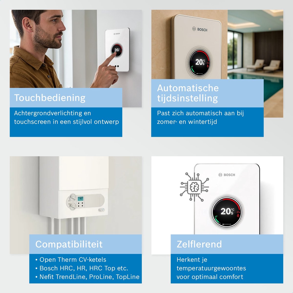 Deze slimme thermostaat is vooral interessant voor huishoudens met een Bosch-, Nefit‑ of Buderus‑cv‑ketel, en voor iedereen die comfort wil combineren met energiebesparing. Hij werkt op veel recente ketels rechtstreeks en kan via een EasyControl Adapter ook met OpenTherm‑ketels overweg. Kort oordeel: een stijlvolle en functionele keuze die je dagelijks comfort verhoogt en verspilling tegengaat, mits je de paar randvoorwaarden (zoals de adapter) meeneemt in je beslissing.