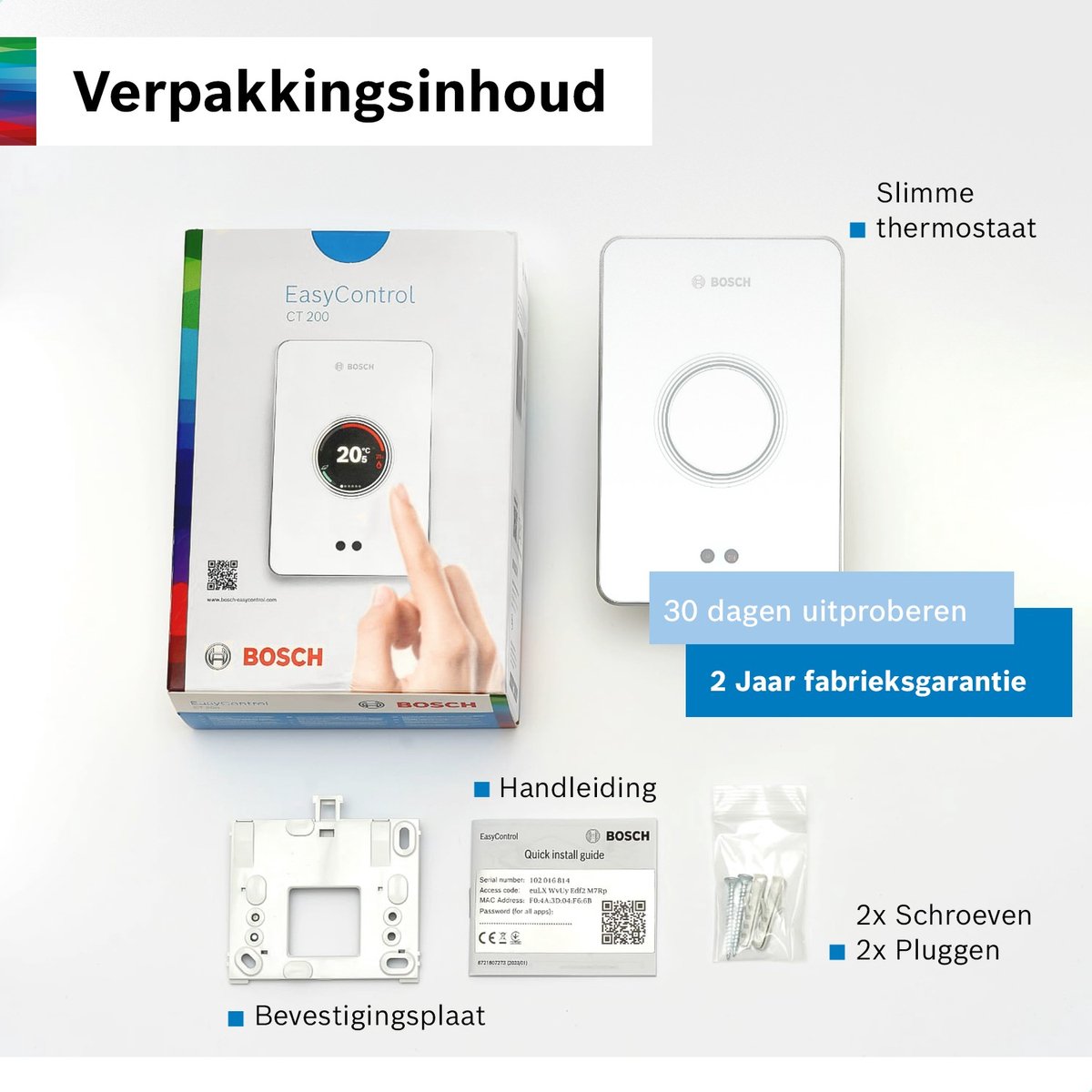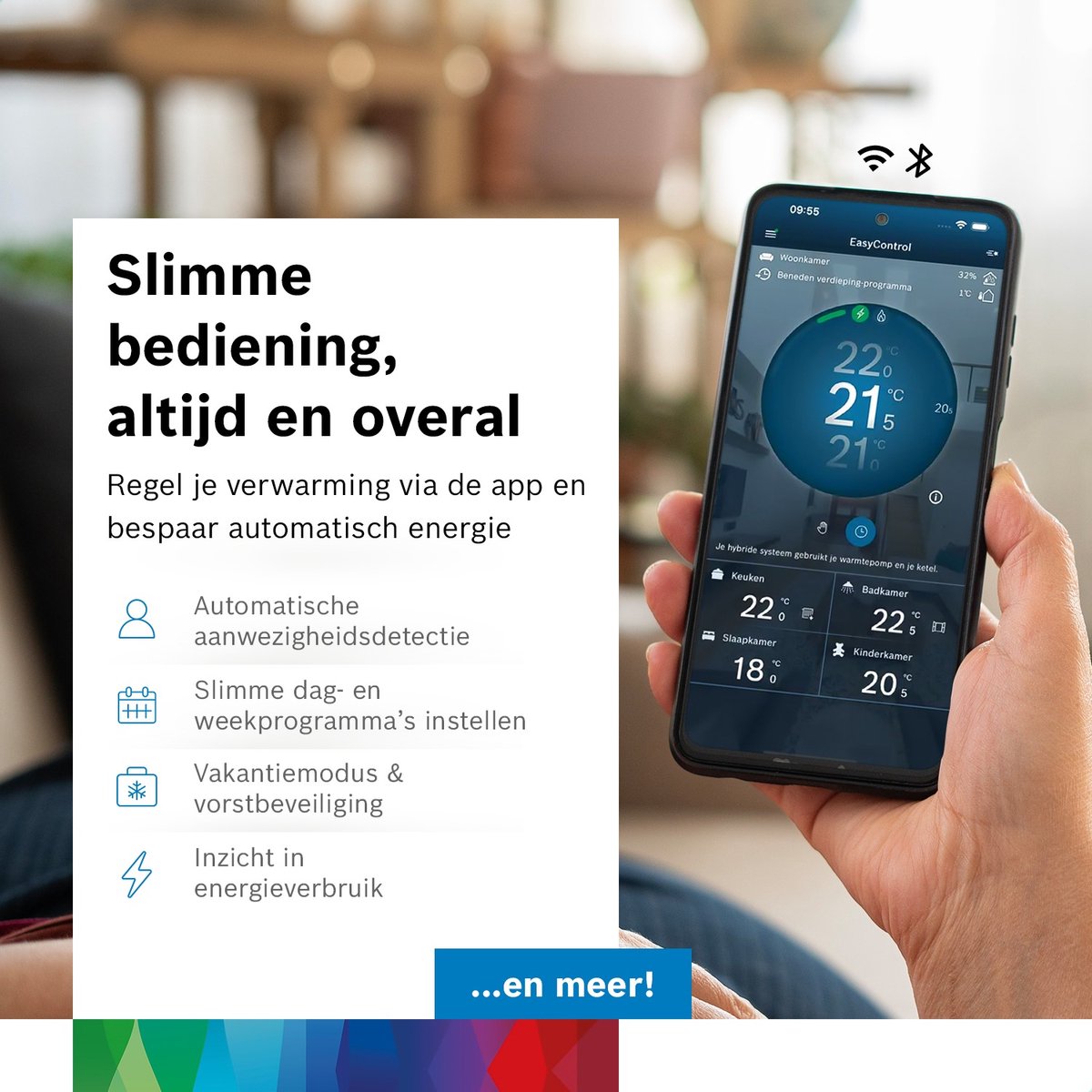 - Waarom een slimme thermostaat zoals de Bosch EasyControl? Omdat hij comfort en gemak samenbrengt: automatische verlagingen bij afwezigheid, proactief verwarmen bij thuiskomst en zicht op verbruik. Met gerichte zoneregeling verwarm je alleen waar nodig.