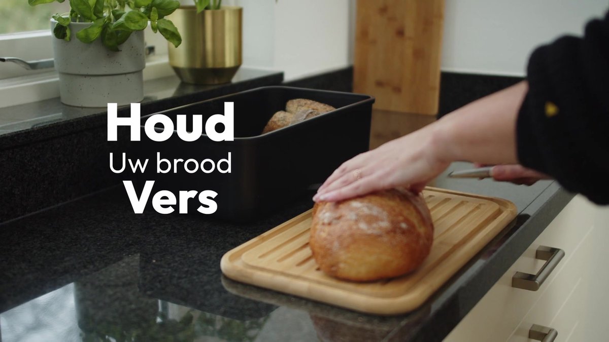 Ergonomisch gezien is dit een prettige combinatie: het deksel tilt makkelijk op, je draait het om en je hebt meteen een snijplank met genoeg werkoppervlak. De hoogte van 11,5 cm maakt het uitnemen van brood eenvoudig; je hoeft niet diep te reiken, en het brood komt niet klem te zitten. De matzwarte kleur oogt modern en past in verschillende keukenstijlen, van minimalistisch tot industrieel. De afgeronde hoeken verzachten het silhouet en voorkomen scherpe randen bij het schoonmaken.