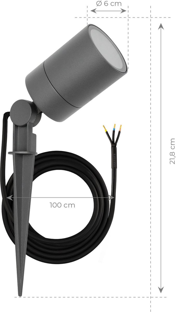 Qua plaatsing is 1 meter kabel voldoende om vanaf de spot naar een nabije lasdoos of verbinder te komen. Voor een groter project met meerdere spots is het handig een hoofdlijn te leggen langs het pad of de border, met om de paar meter aftakkingen en waterdichte verbindingen. Hou er rekening mee dat de spot een armatuur is dat geschikt is voor GU10; het daadwerkelijke lichtniveau en de energieprestatie hangen af van de gekozen lichtbron. De productvermelding noemt 5 W en energieklasse G; beschouw dat als de referentie uit de listing. Kies je zelf een andere GU10-LED, dan kunnen verbruik en lichtopbrengst verschillen.