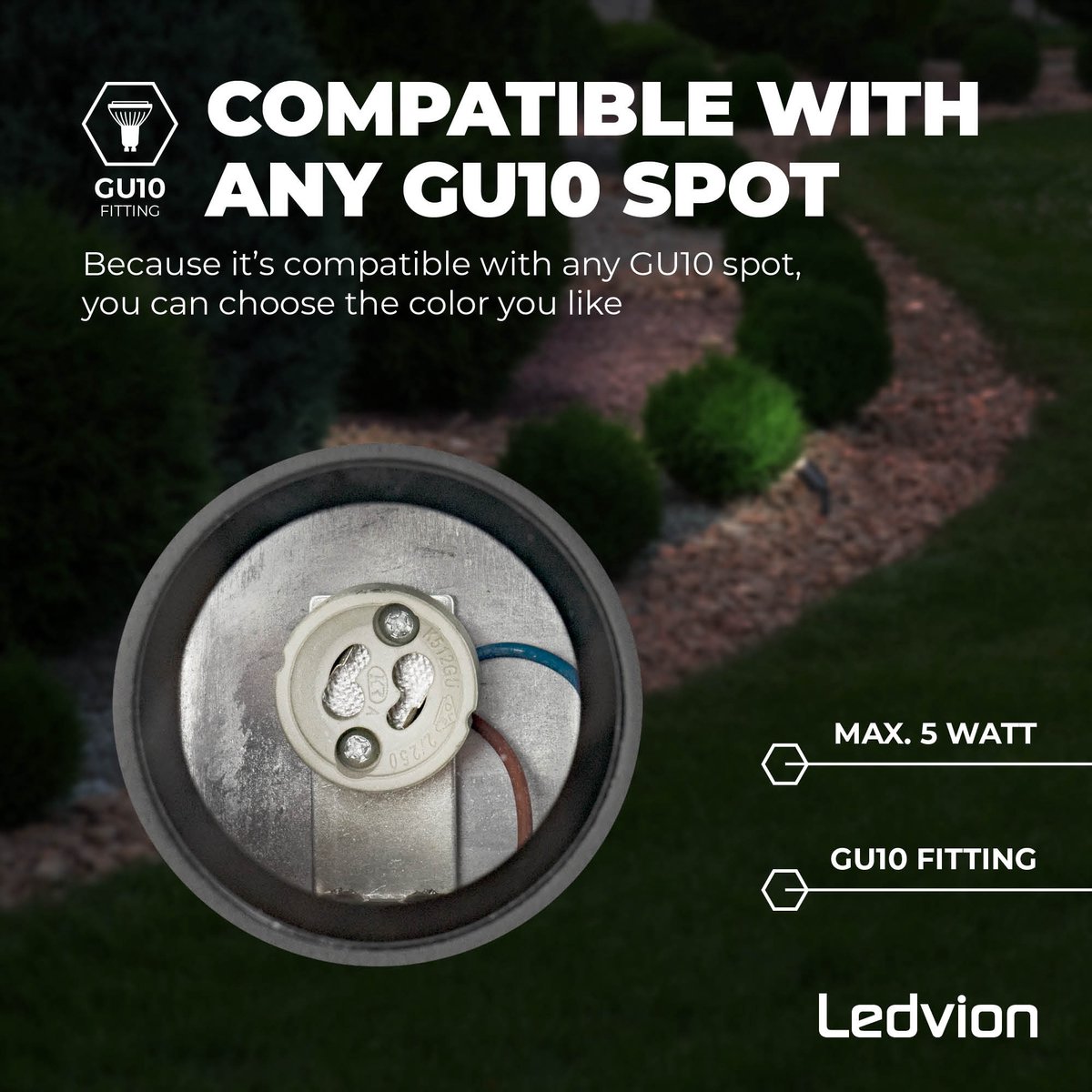 Klaar om je tuin ’s avonds tot leven te brengen met gericht, stijlvol licht? Kies je gewenste GU10-lichtbron, voorzie een waterdichte aansluiting en plaats deze spot precies waar het effect het mooist is.