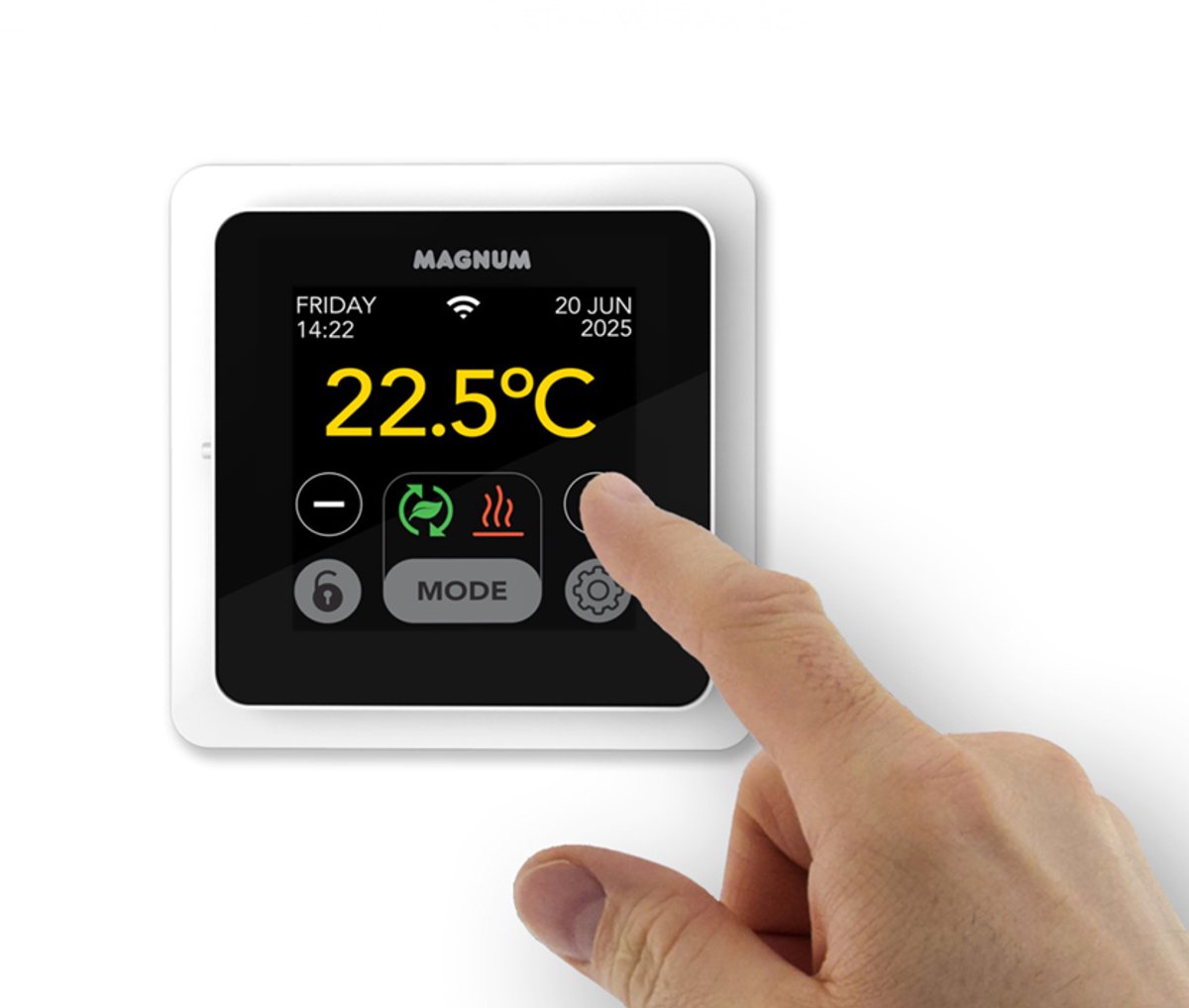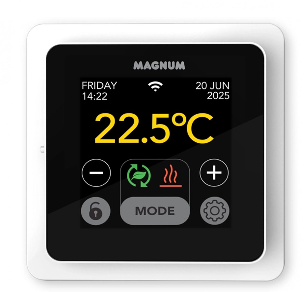 De MAGNUM MRC² is een inbouw-thermostaat voor elektrische vloerverwarming die comfort slim regelt in Nederlandse woningen. Met een houtenvloerenfunctie die de temperatuur tot 28°C begrenst, combineert hij veiligheid met efficiëntie. Het grotere kleurenscherm en de intuïtieve bediening maken instellen eenvoudig.