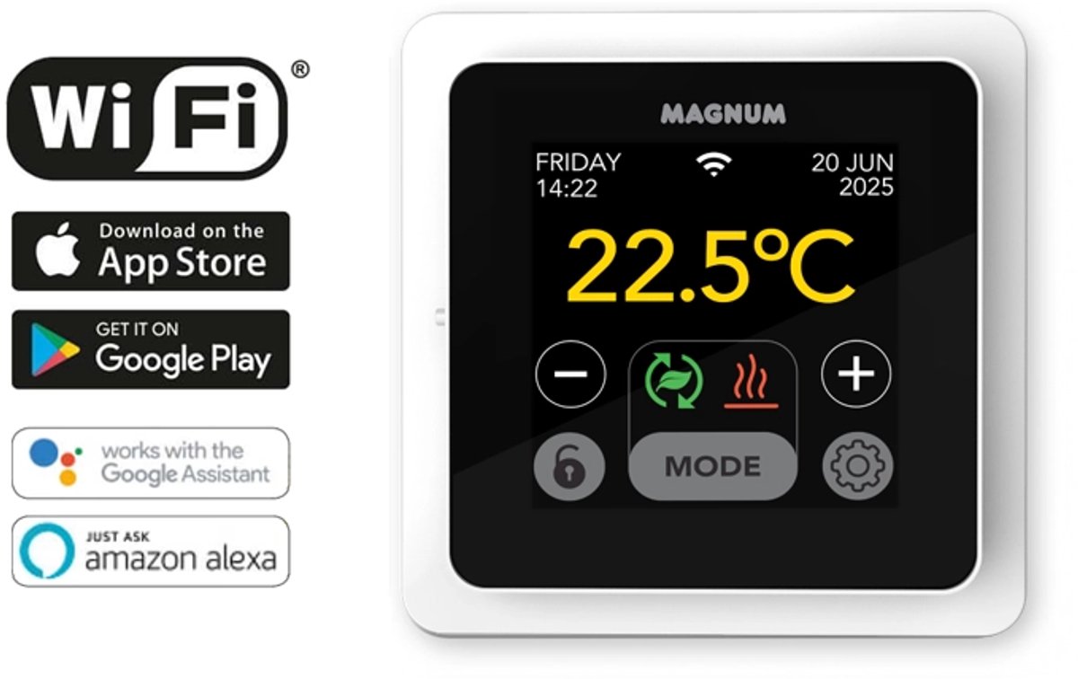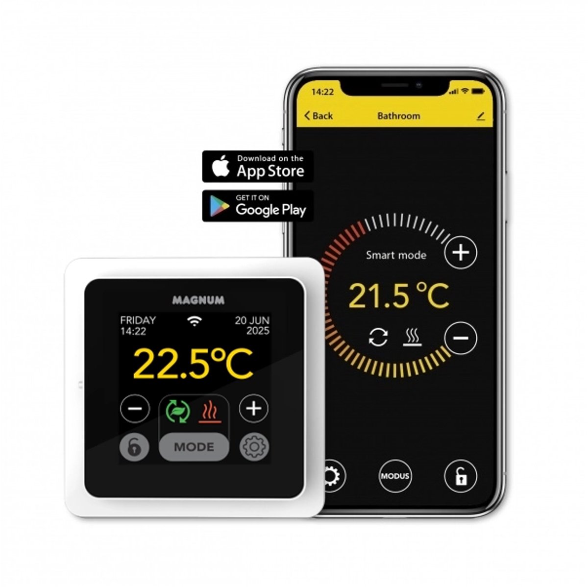 De MAGNUM Remote Control 2 is een stijlvolle, intuïtieve inbouw-thermostaat met wifi en klokfunctie, speciaal ontwikkeld voor elektrische vloerverwarming. Met een groter, helder scherm en een vernieuwde, logische bediening is hij toegankelijk voor iedereen die comfort wil combineren met zuinig verwarmen. De thermostaat leert zelf hoe lang voorverwarmen nodig is en stemt het programma automatisch af op jouw ritme, zodat de vloer op het juiste moment precies op temperatuur is.