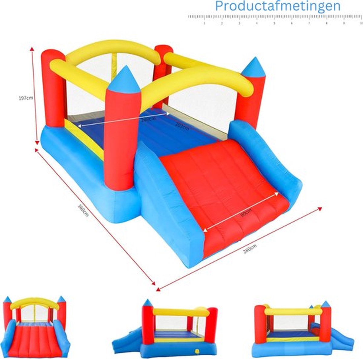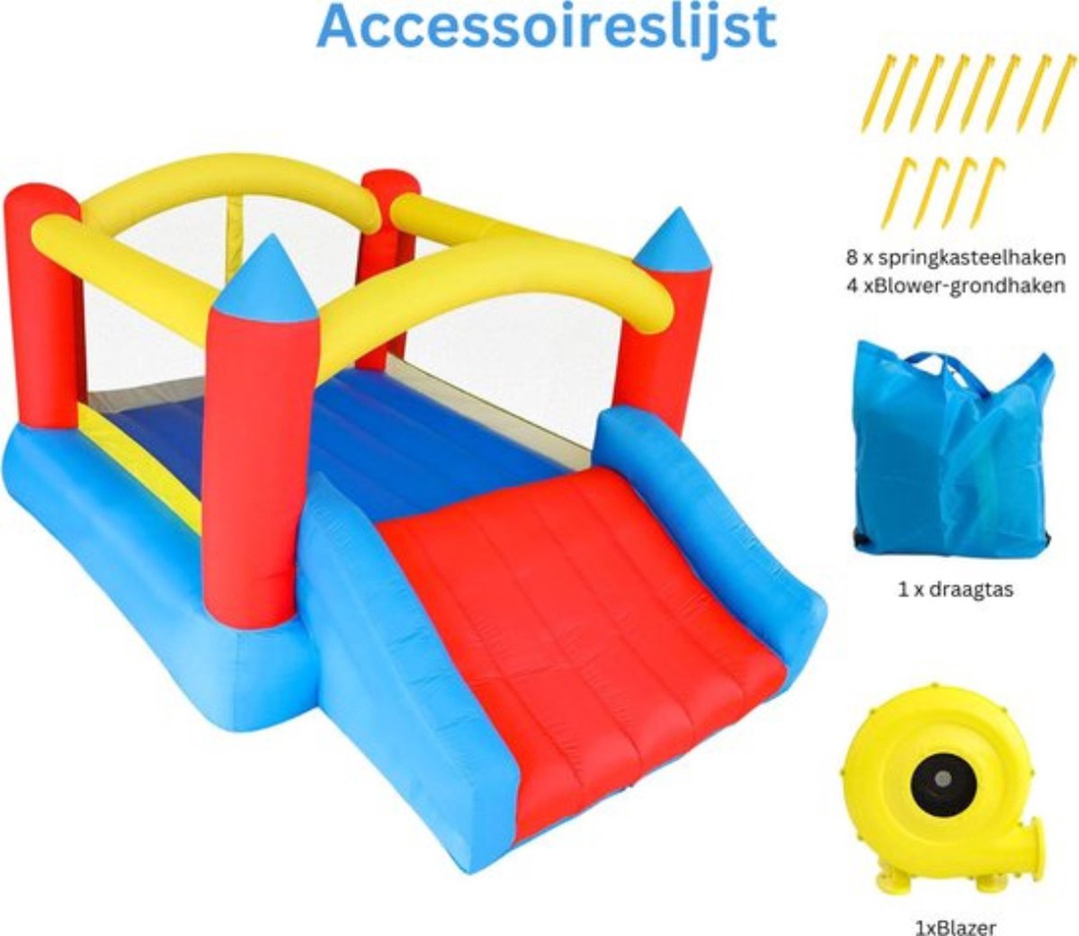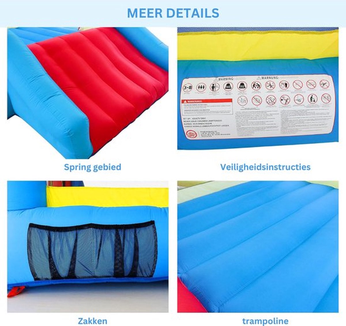 De omschrijving vermeldt dat het springkasteel snel klaar is met het “eenvoudige opblaasmechanisme”. In de praktijk betekent dit meestal: aansluiting op een elektrische of handpomp en enkele minuten wachten tot de structuur stevig aanvoelt. Controleer tijdens het oppompen of de randen egaal gevuld zijn en dat het kussen niet lekt.