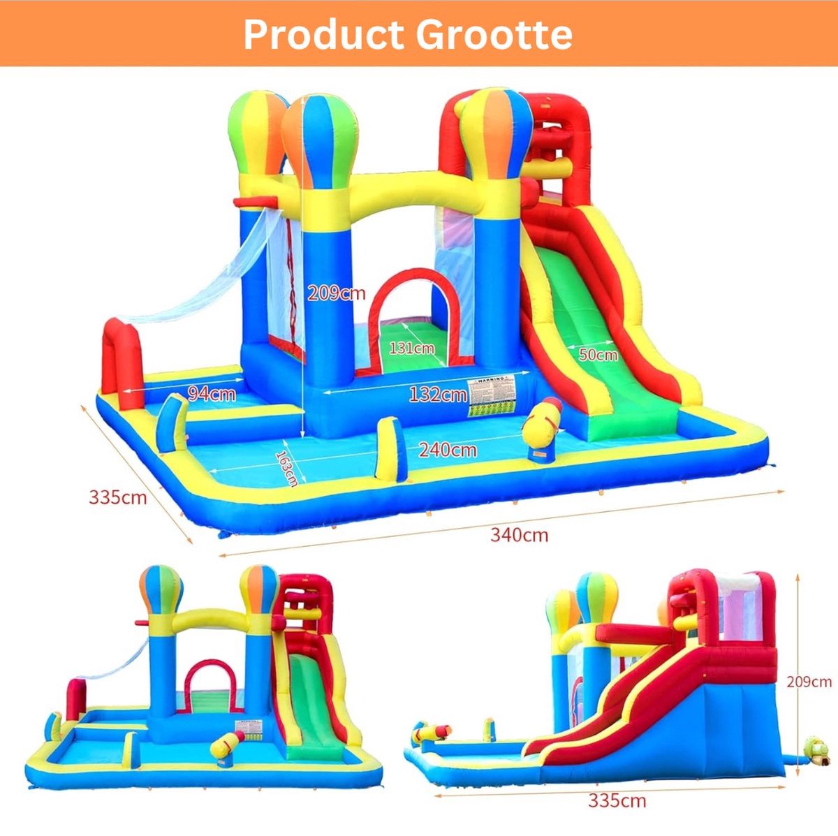 Afmetingen van het pakket zijn 360 x 335 x 209 cm. Dit formaat betekent dat het kasteel voldoende speelruimte biedt voor meerdere kinderen, maar het vereist wel een redelijk groot vlak oppervlak van minstens 4 x 4 meter inclusief vrije ruimte rondom. Met een maximale belasting van 120 kg (max. 30 kg per kind) is het vooral afgestemd op jongere kinderen; tieners en zwaardere gebruikers passen hier niet veilig op.