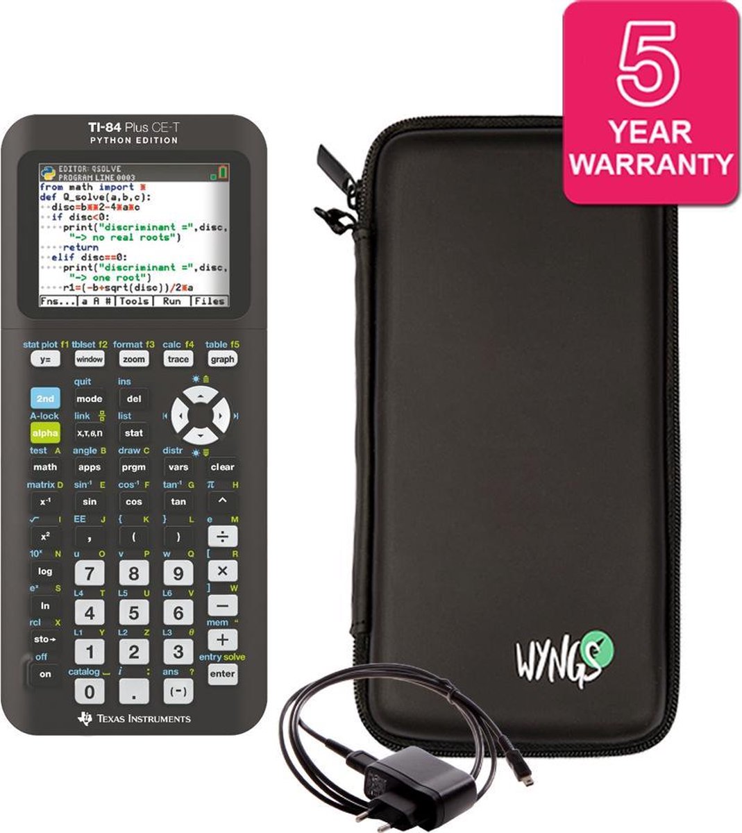 De TI-84 Plus CE-T is een grafische rekenmachine met kleurenscherm en programmeermogelijkheden die zich richt op scholieren en studenten die wiskunde en vakken met grafieken en programmeren serieus nemen. Dit model biedt vergelijkbare eigenschappen als de bekende TI-84 Plus CE-T-serie, inclusief een hoge resolutie backlight-kleurenscherm en een oplaadbare batterij, plus een Python-app voor basisprogrammering.