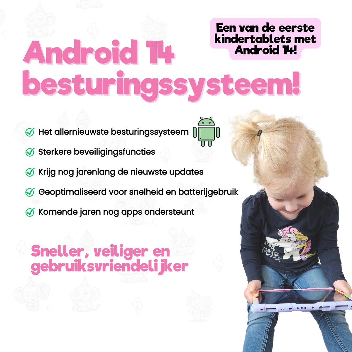 De tablet draait op Android 14, het nieuwste en veiligste Android-besturingssysteem volgens de productomschrijving. Een recente OS-versie betekent doorgaans betere beveiliging, langere ondersteuning voor updates en nieuwere privacyfuncties (bron: listing, checked 2025). In de praktijk zorgt dit voor een stabiele en actuele basis waarop apps soepel draaien en waarmee ouders langer verzekerd zijn van veiligheidsverbeteringen.