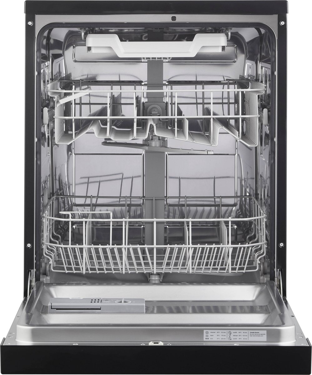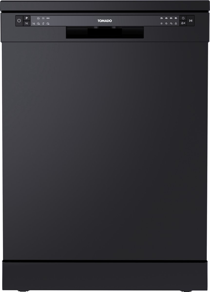De Tomado TDW6001B is een vrijstaande zwarte vaatwasser met ruimte voor 14 couverts en zes wasprogramma’s. Hij richt zich op huishoudens die een compacte, gebruiksvriendelijke machine zoeken met praktische functies zoals halve belading, een besteklade en uitgestelde start.