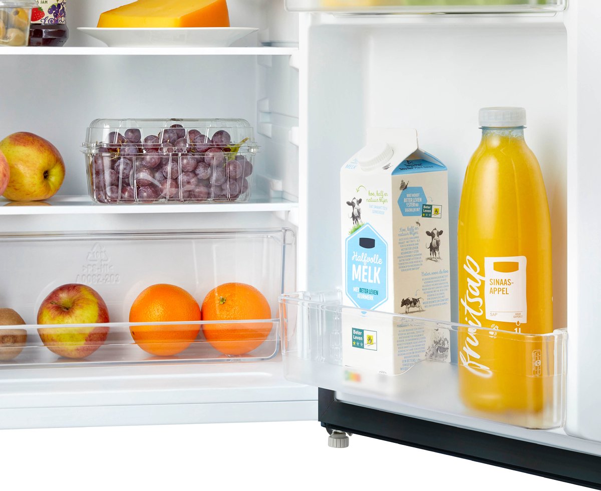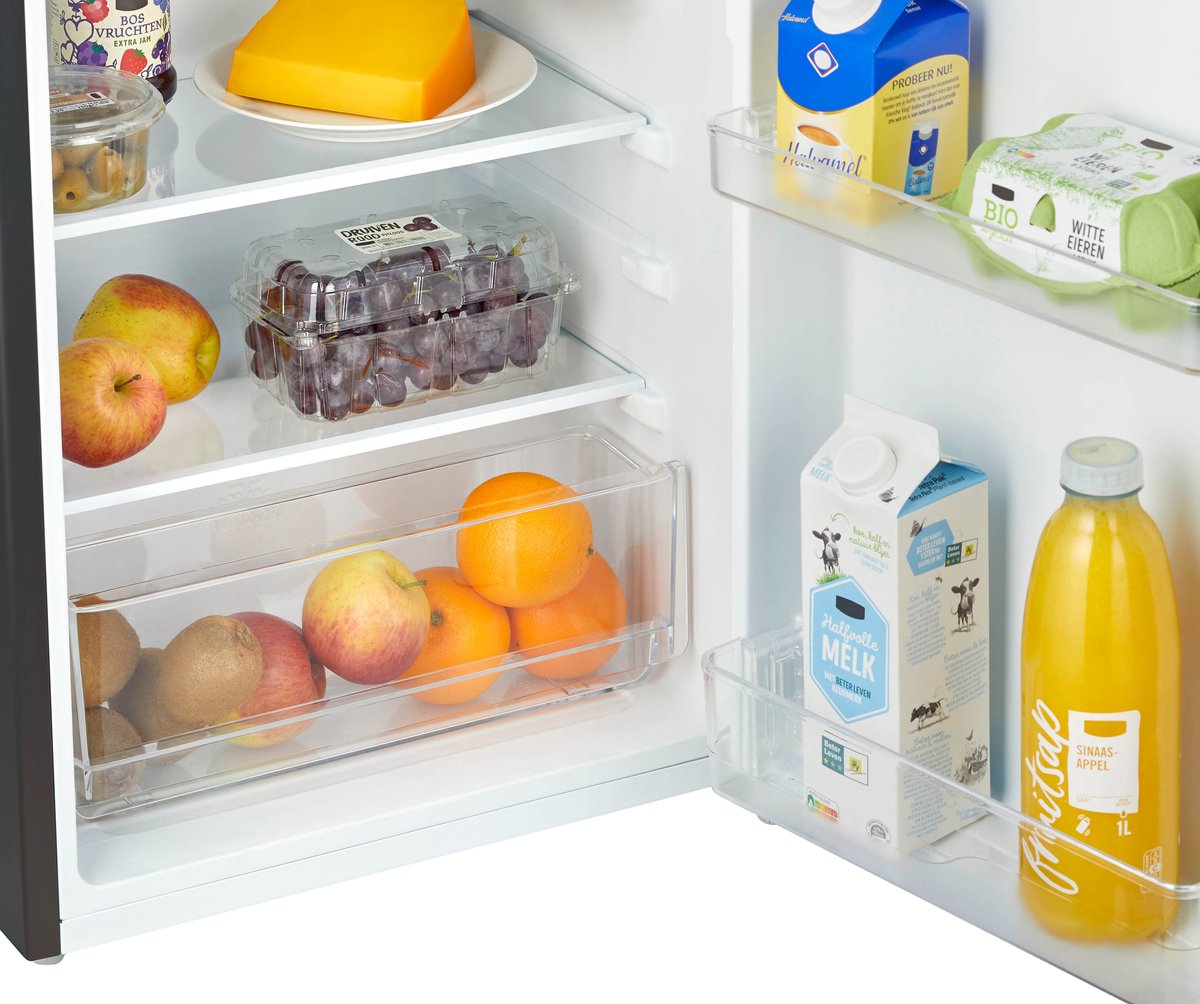 Van binnen valt de overzichtelijke indeling op. De geharde glazen plateaus zijn stevig en eenvoudig schoon te maken. Eén plateau is verstelbaar, zodat je de hoogte kunt aanpassen aan hogere flessen of pannen. De groentelade houdt groenten en fruit bij elkaar en beschermd tegen uitdrogen. In de deur vind je drie deurvakken voor flessen, sauzen en kleinere verpakkingen. Bovenin zit het vriesvak voor het bewaren van bijvoorbeeld brood, diepvriesgroenten of ijsjes.