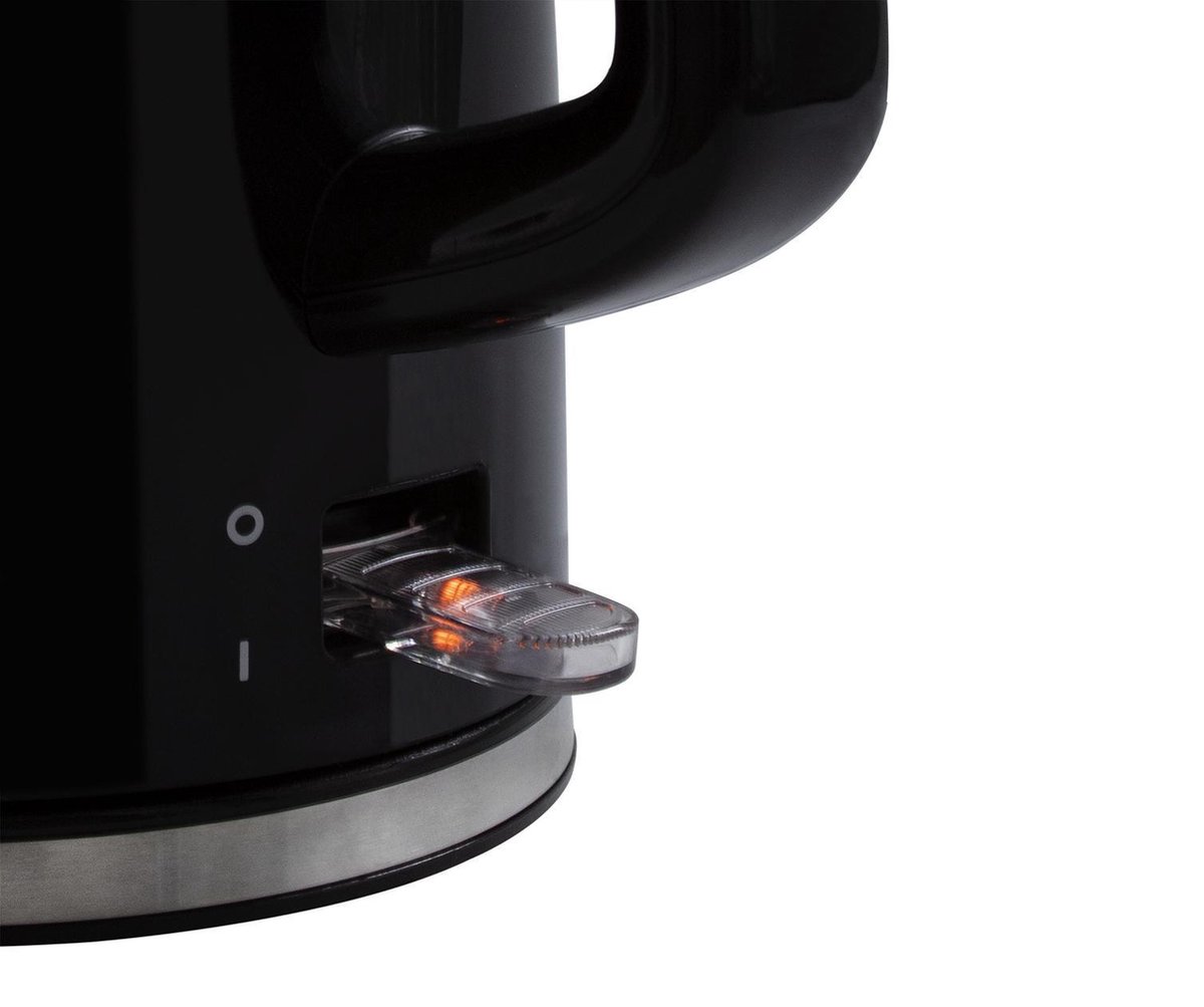 De Tomado TWK1701B combineert een tijdloos, minimalistisch ontwerp met praktische materialen. De behuizing is van kunststof in hoogglans zwart. Dat materiaalkeuze heeft twee voordelen in dagelijks gebruik: het voelt licht aan in de hand en blijft aan de buitenkant relatief koel tijdens het koken. De rand van de voet heeft een strak roestvrijstalen accent, waardoor de waterkoker ondanks zijn eenvoud een nette uitstraling geeft op het aanrecht.