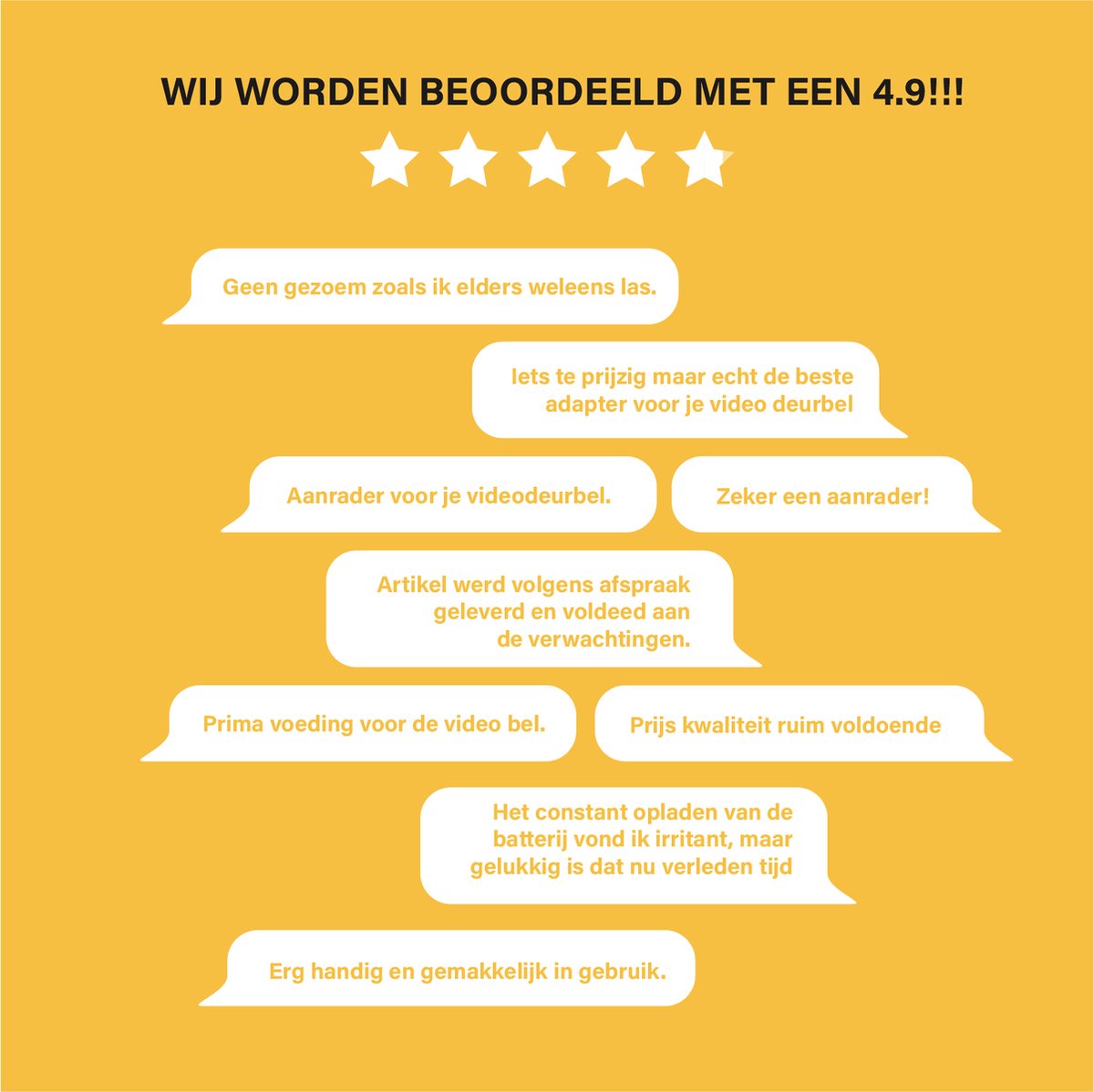 Het enige minpunt zit niet in de adapter, maar in de batterij-deurbel. Als je deurbel bij elke beweging een opname maakt en je hebt op een dag meer dan 100 opnames, dan zal de batterij alsnog langzaam leeglopen. Gebruik je alleen de belfunctie of heb je weinig opnames, dan laadt de batterij wel naar 100%. Heb je geen batterij-deurbel, dan is deze adapter ideaal. Maar ook bij een batterijmodel zorgt de adapter ervoor dat je veel minder vaak hoeft bij te laden wanneer de batterij wordt leeggetrokken door veel opnames. Een batterij-deurbel is simpelweg niet geschikt om bijna 24/7 op te nemen.