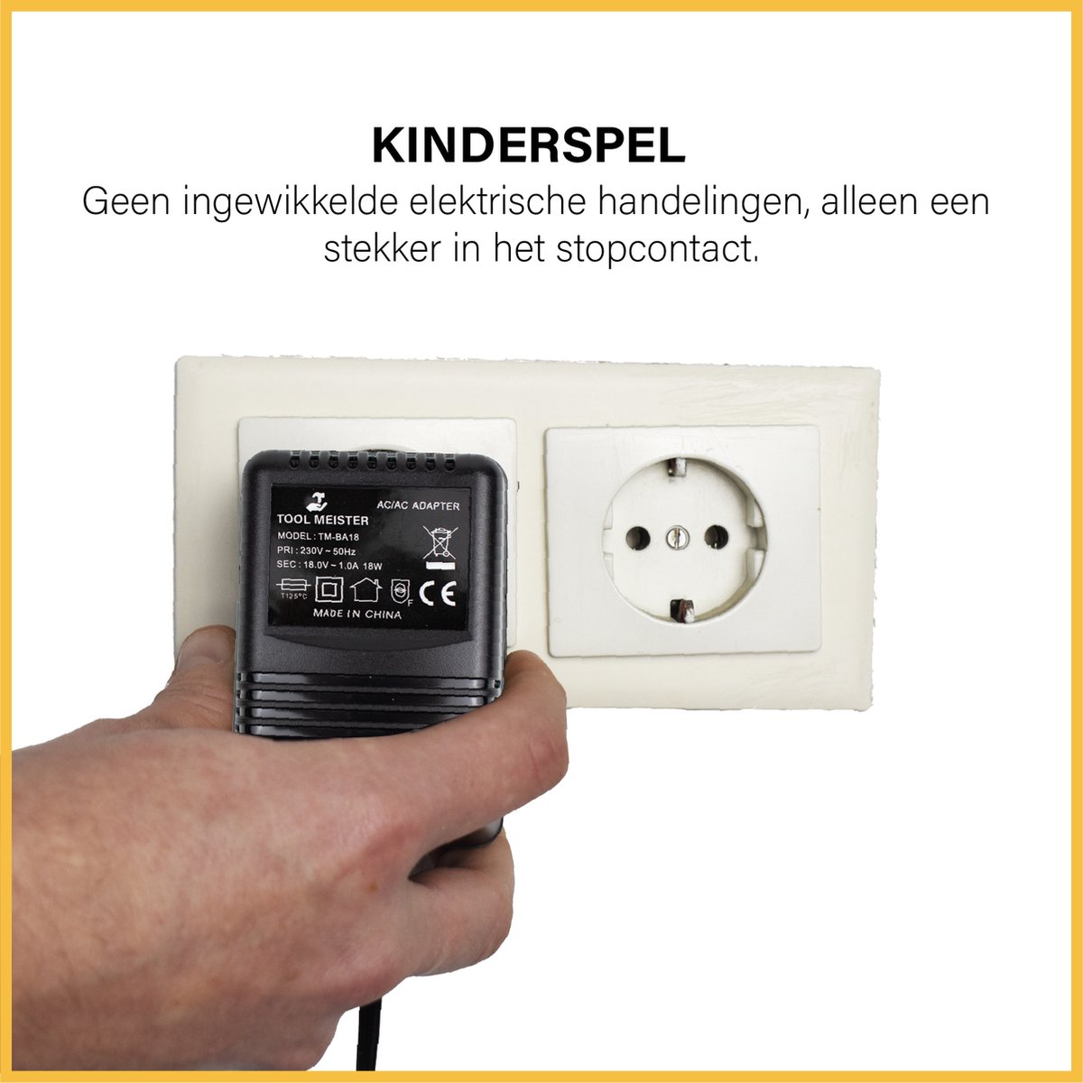 De Tool Meister BA-18 is bij uitstek geschikt voor iedereen die zonder ingrepen in de meterkast een videodeurbel stabiel op netstroom wil laten draaien. De combinatie van 18V AC, 1A, 18W, 5 meter kabel, CE-markering, lage temperatuurstijging en 3 jaar garantie maakt dit een zorgeloze keuze voor dagelijks gebruik.