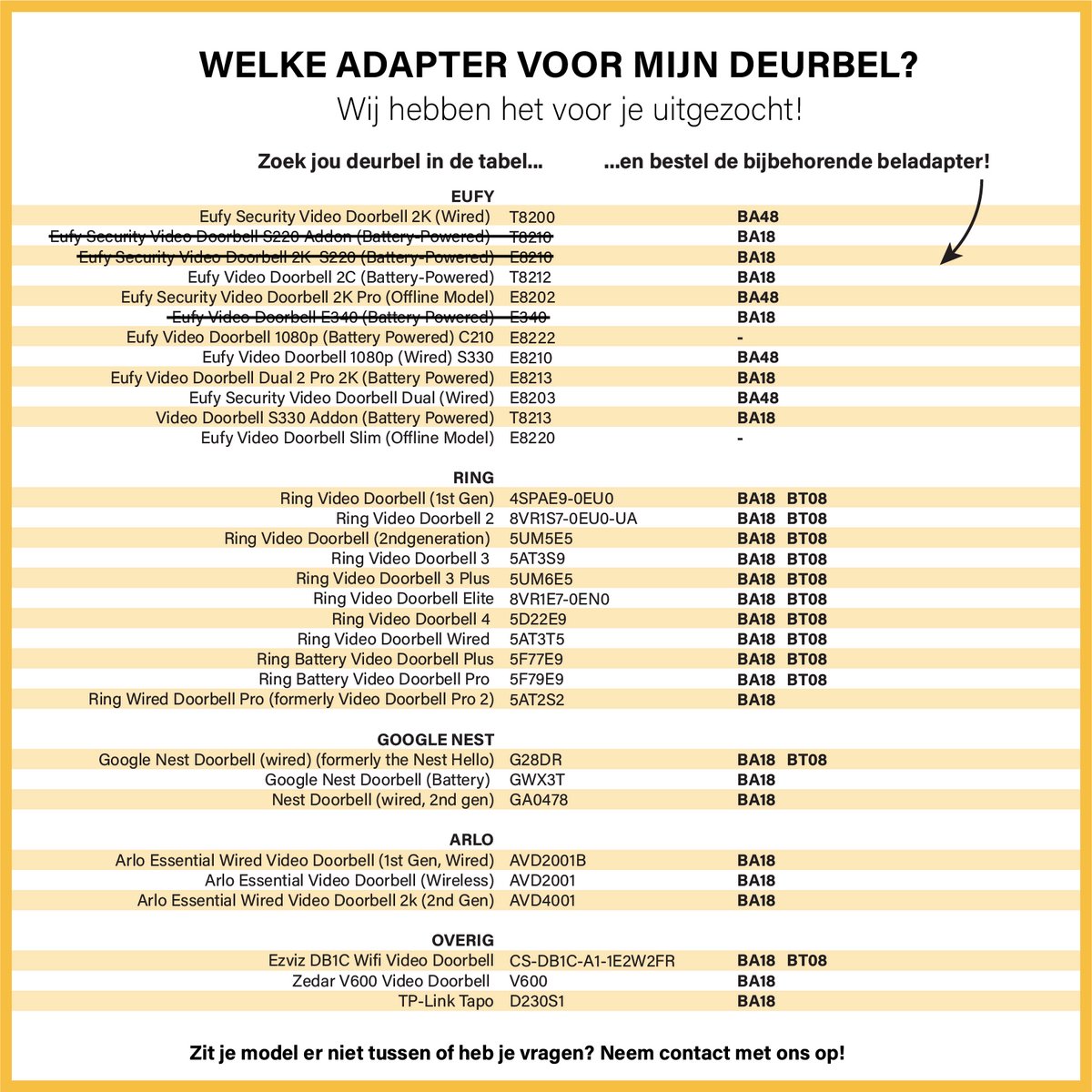 Heb je een specifieke Ring-, Nest-, Eufy- of Arlo-deurbel? Raadpleeg de compatibiliteitslijst hierboven of de tabel bij de productfoto’s. Twijfel je? Neem contact op met de aanbieder voor een check; dat voorkomt retourzendingen en scheelt tijd.