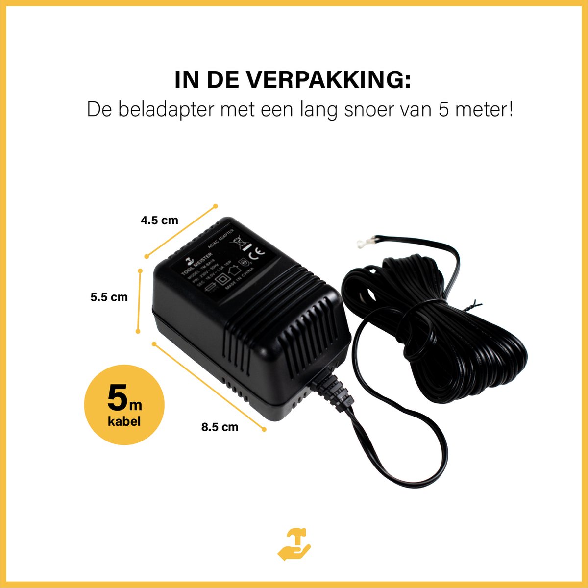 De Tool Meister BA-18 is een compacte adapter met geïntegreerde kabel. De afmetingen zijn 7,3 × 2,5 × 8 (eenheid niet opgegeven door de fabrikant), waardoor hij past in de meeste standaard stopcontactposities, ook achter meubilair of in een gangkast. De kabel is 5 meter lang, wat in de praktijk het verschil kan maken: je kunt het stopcontact gebruiken dat het handigst is, zonder meteen te moeten verlengen.