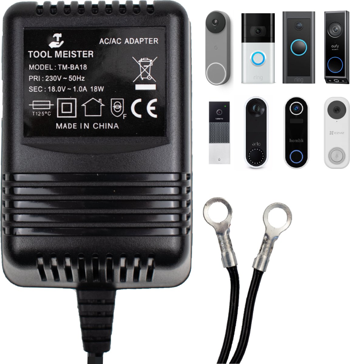 De Tool Meister BA-18 is een bel adapter waarmee je je slimme deurbel veilig en eenvoudig rechtstreeks op het stopcontact aansluit — zonder elektricien nodig. Hij zet 230V/50Hz om naar 18V wisselspanning (18W) en wordt geleverd met 5 meter kabel voor een snelle, nette installatie.