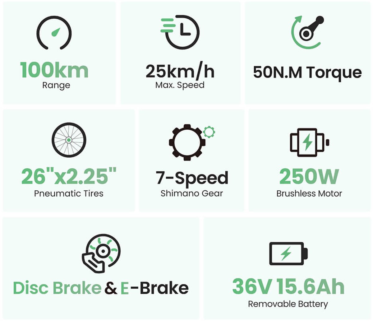 | Afneembare 561,6 Wh accu, volgens fabrikant tot 100 km bereik onder ideale condities | Geen expliciete vermelding van vering; comfort komt vooral van banden en zitpositie |
