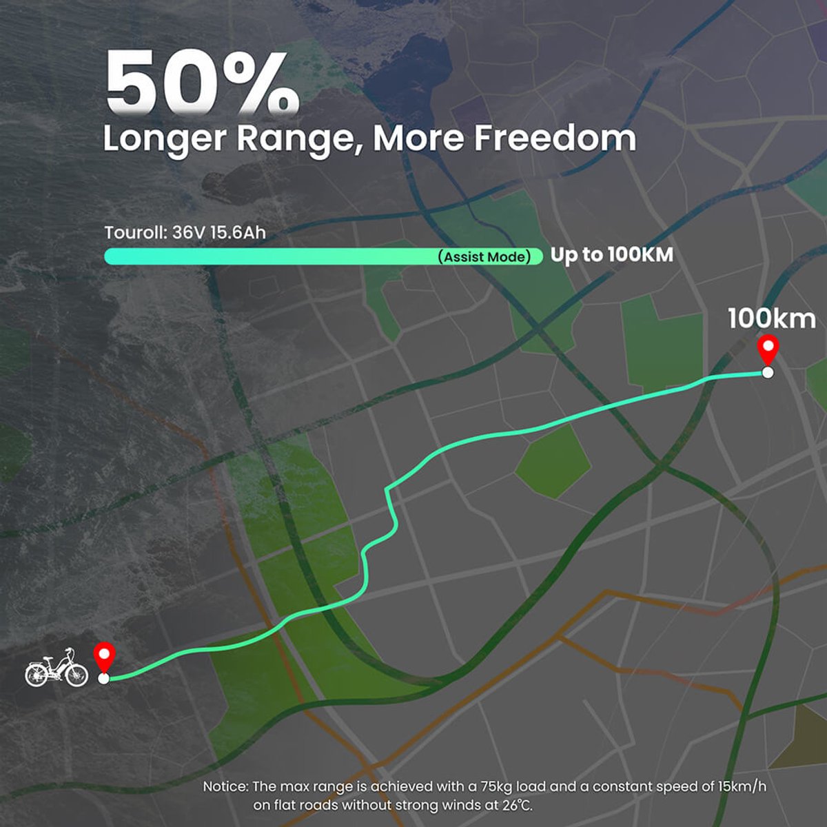 - Rijd verder, tot 100 km bereik dankzij 561,6 Wh accu.
