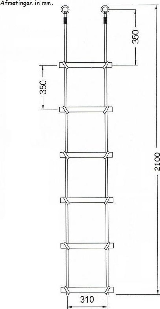 De listing noemt expliciet dat het product is vervaardigd met pp-touw (polypropyleen), een veelgebruikt materiaal voor buitengebruik vanwege zijn lichte gewicht en weerstand tegen vocht. De ladder heeft zes sporten; de totale lengte is 220 cm volgens de verkoper. Verder wordt in de omschrijving de maat “diam. 3,5×40 cm” genoemd — de exacte interpretatie daarvan (bijvoorbeeld diameter van het touw versus afmeting van de sporten) is niet verder gespecificeerd in de listing. Voor nauwkeurige installatie- of veiligheidsberekeningen is het raadzaam de verkoper te raadplegen.