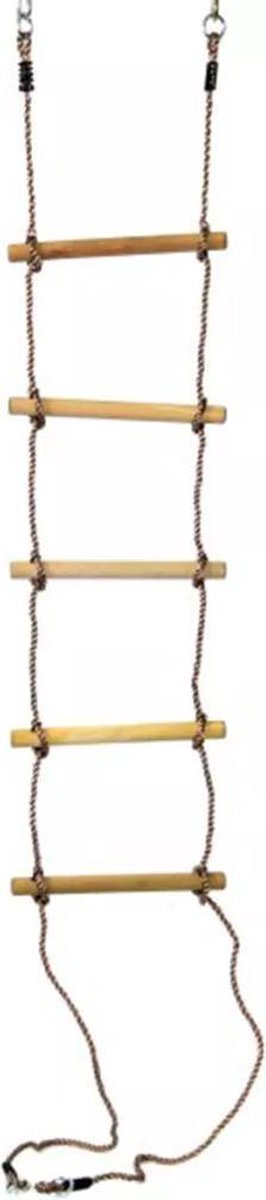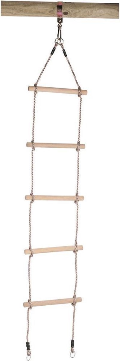 Robuuste combinatie van PP touw en houten sporten — goede balans tussen flexibiliteit en stevigheid (bron: listing, gecontroleerd 2025). | Beperkte lengte (2 m) en slechts 5 sporten; minder geschikt voor hogere speeltorens of oudere kinderen die meer uitdaging zoeken. |