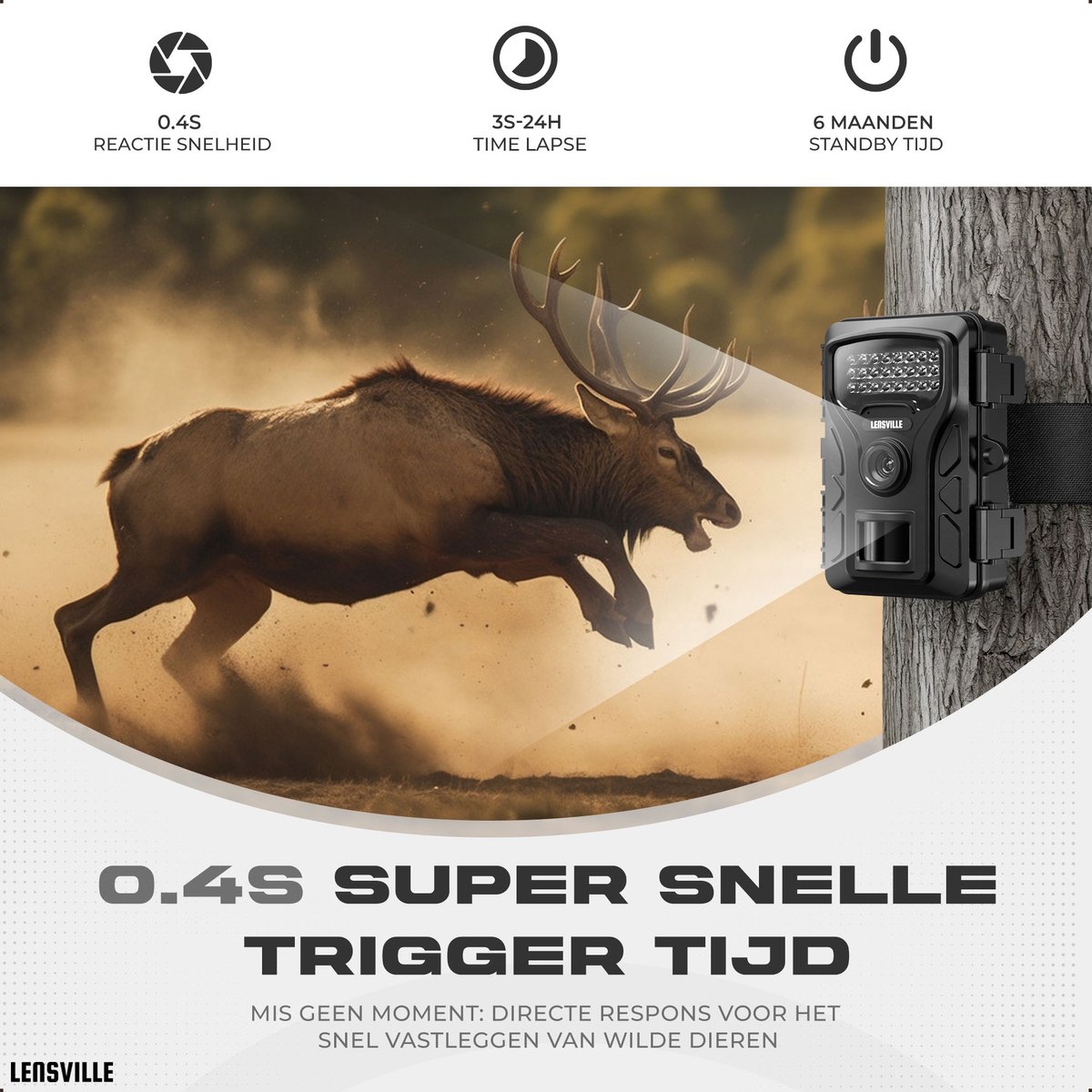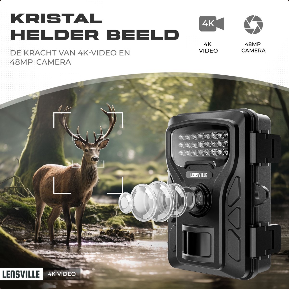 Overzicht:De Lensville TR220 outdoor wildcamera is een waterdichte, gebruiksvriendelijke camera voor Nederlandse natuurliefhebbers, perfect voor jaarrond observatie. Met 48MP foto’s en ondersteuning voor 128GB SD-kaarten leg je elk detail haarscherp vast.