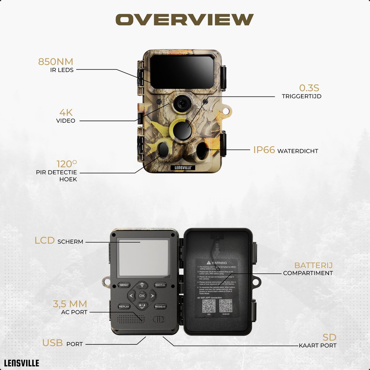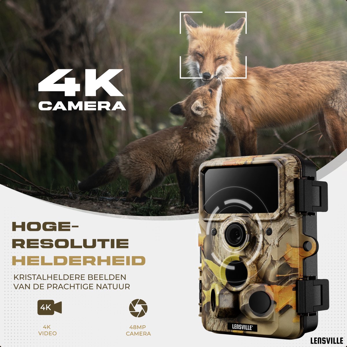 De Lensville TR225 Outdoor Wildcamera is een weerbestendige, opzetbare buitencamera voor het vastleggen van dieren en spontane buitenmomenten. Hij levert hoge resolutie foto’s (tot 48MP) en 4K-video, heeft WiFi-connectiviteit via een gratis app en een duidelijk 2,4″ IPS-scherm voor instellingen en preview. Deze combinatie maakt de camera geschikt voor natuurfotografen, jagers, onderzoekers en hobbyisten die betrouwbare, gedetailleerde opnames buiten willen maken.