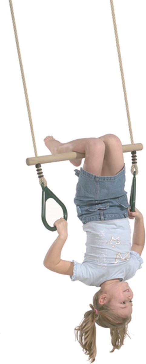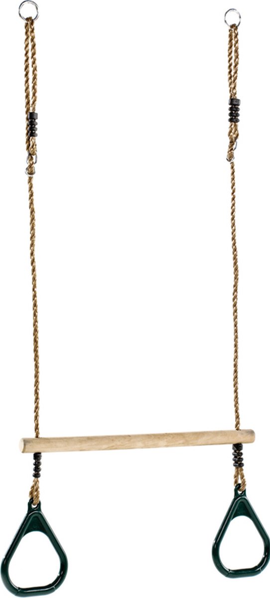 De Houten ringtrapeze met kunststof ringen groen is een speeltoestel bedoeld voor kinderen (en volwassenen die willen trainen) die balans, kracht en motoriek willen oefenen. Het combineert een massief houten trapezebalk met kunststof beklede metalen ringen en verstelbare touwen, ontworpen voor gebruik in de tuin of op een speeltoestel.
