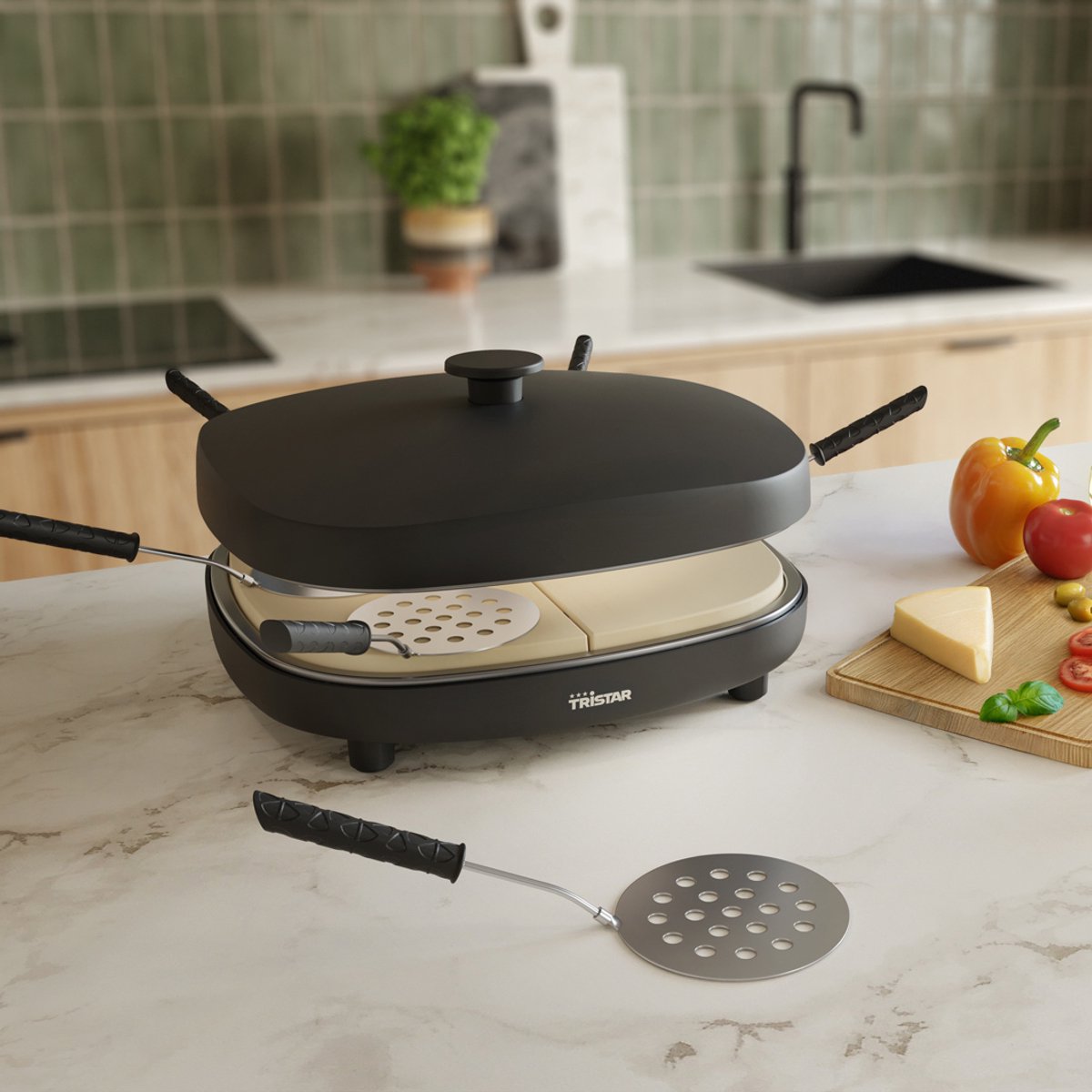 Over afmetingen van de buitenkant en het gewicht geeft de vermelding geen gegevens. De plaatomvang suggereert een compacte voetafdruk, wat het opbergen in een keukenkastje waarschijnlijk eenvoudig maakt. De ergonomie is gericht op samen tafelen: je kunt gelijktijdig met zes spatels werken, waardoor iedereen gemakkelijk zijn eigen pizza kan schuiven, controleren en serveren. De verwijderbare plaat is een groot pluspunt voor het onderhoud: je tilt het oppervlak eruit en maakt het sneller schoon, zonder te hoeven manoeuvreren met de hele behuizing.