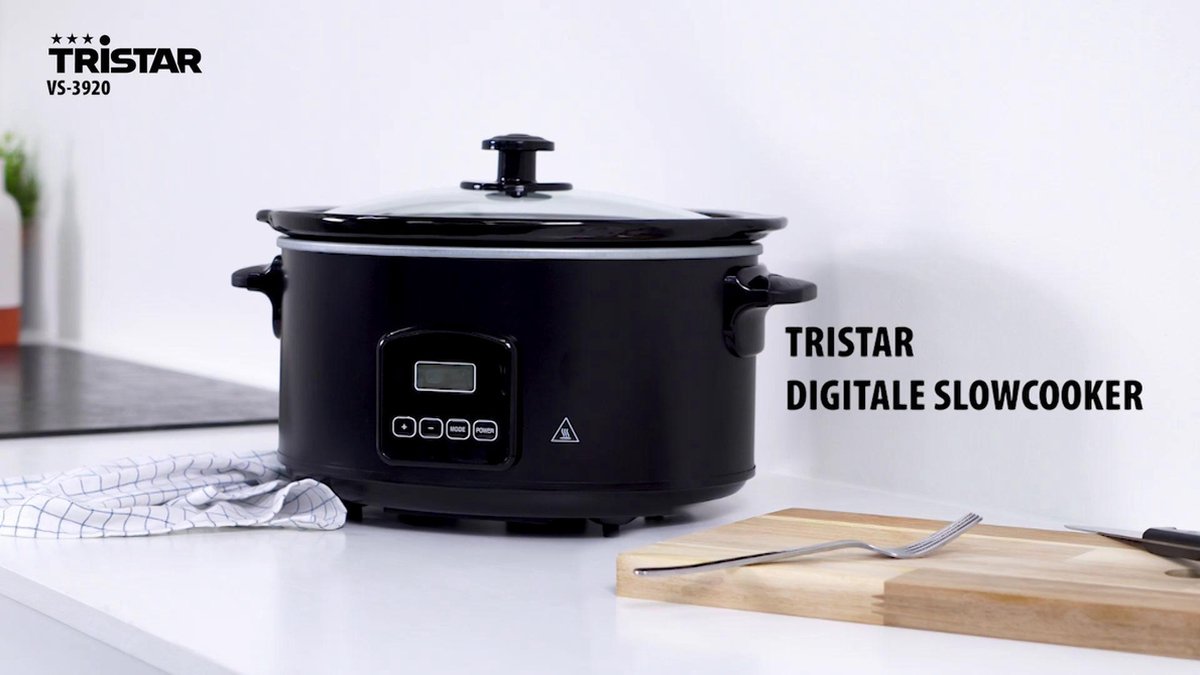 De Tristar VS-3920 slowcooker is een compacte, digitale slowcooker waarmee je met minimale inspanning smaakvolle, langzaam gegaarde gerechten op tafel zet. Met een inhoud van 4,5 liter, een keramische binnenpan en een eenvoudig digitaal scherm met timer is hij gericht op dagelijks gemak en betrouwbare resultaten. Volgens de fabrikant blijven voedingsstoffen beter behouden door de lage kooktemperaturen, en blijft vlees heerlijk sappig door de langzame garing.