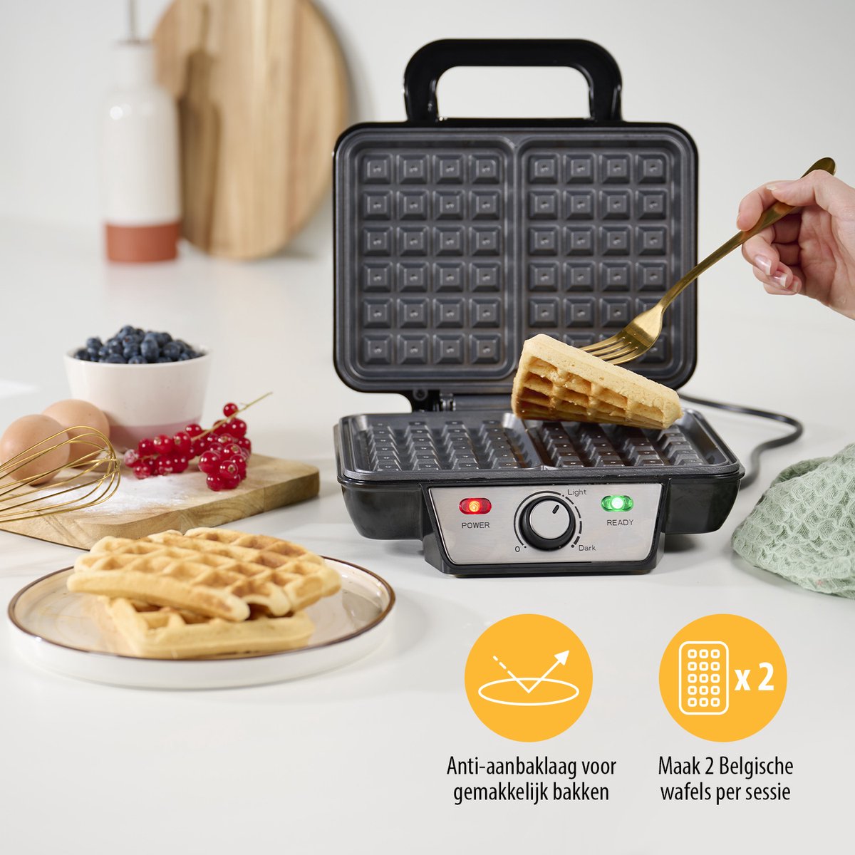 Het ontwerp is gericht op efficiëntie: je bakt standaard twee wafels per keer. In de praktijk kun je daarmee een klein gezin in enkele rondes bedienen. Omdat de platen het beschikbare oppervlak goed gebruiken, zijn de wafels lekker royaal, zonder dat het apparaat zelf veel ruimte inneemt. Het helpt om steeds dezelfde hoeveelheid beslag te gebruiken—bijvoorbeeld met een schenkkannetje of een maatbeker—zodat beide wafels even dik worden en tegelijk klaar zijn.