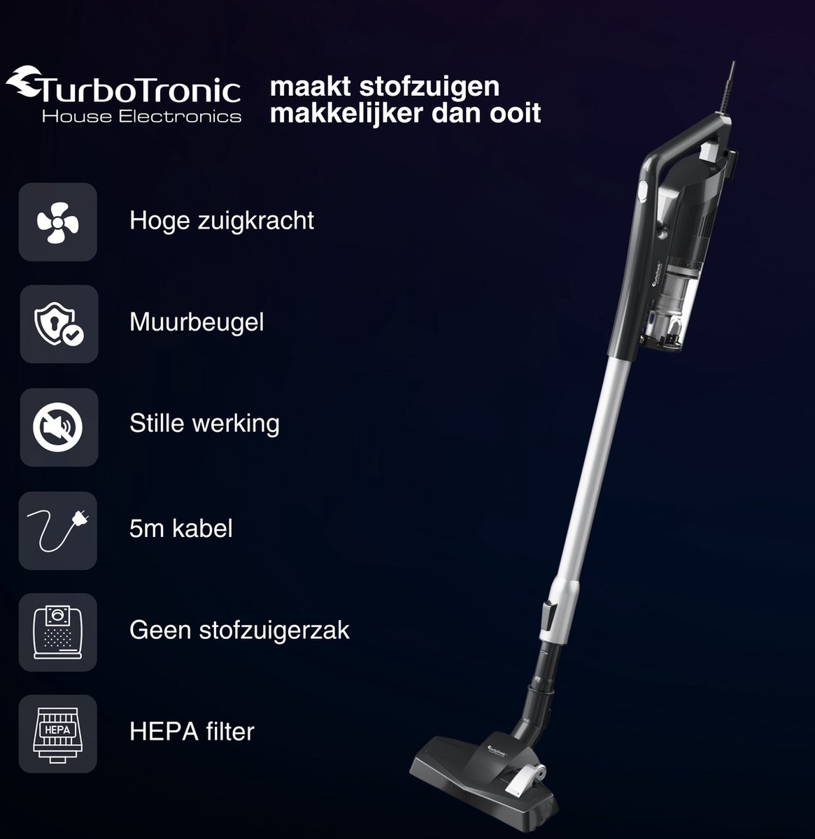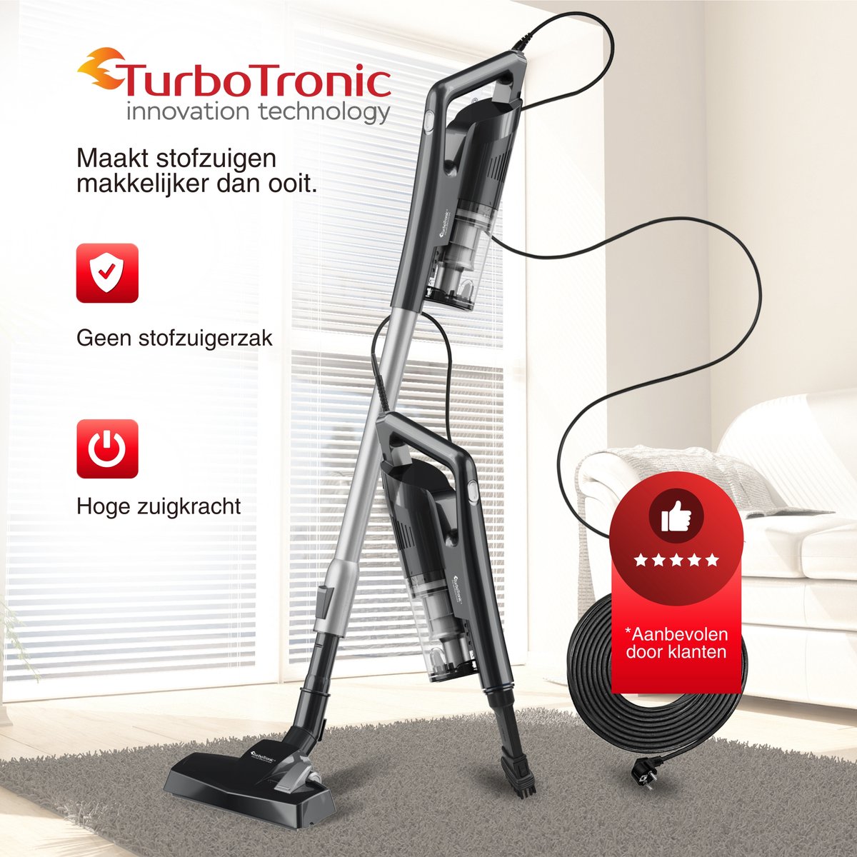 De TurboTronic MF8 steelstofzuiger is een overtuigende keuze als je een lichte, stille en zakloze steelstofzuiger met snoer zoekt die zowel harde vloeren als hoogpolige tapijten goed aankan. De combinatie van 14 kPa vacuümdruk, cyclonische technologie en herbruikbare filters levert solide prestaties en lage gebruikskosten. De ergonomie is sterk, met dank aan de telescopische buis en het lage gewicht, en het geluidsniveau tot 80 dBA is prettig in de dagelijkse praktijk.