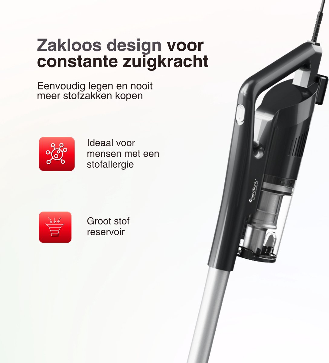 De TurboTronic MF8 steelstofzuiger is een krachtige, maar opvallend lichte stofzuiger met snoer die inzet op moeiteloos dagelijks schoonmaken. Dankzij het zakloze systeem met herbruikbare filters en cyclonische technologie combineert hij sterke zuigprestaties met eenvoudige bediening en lage gebruikskosten. Met 600 W motorvermogen, een opgegeven zuigkracht van 91 W en een vacuümdruk van 14 kPa volgens de fabrikant is dit een serieuze schoonmaakhulp voor zowel harde vloeren als hoogpolige tapijten.