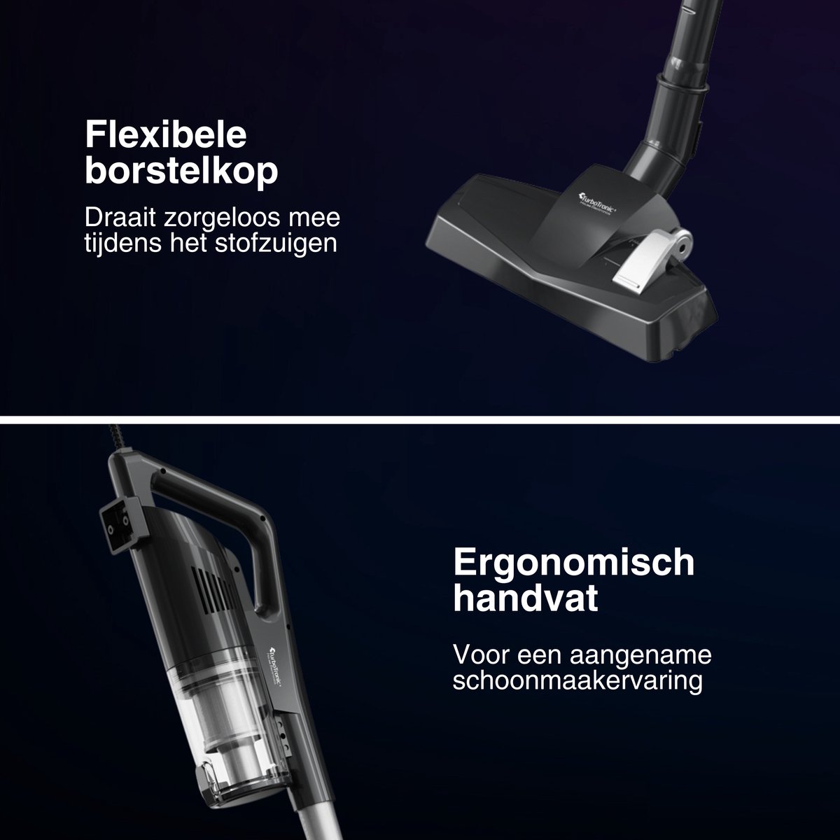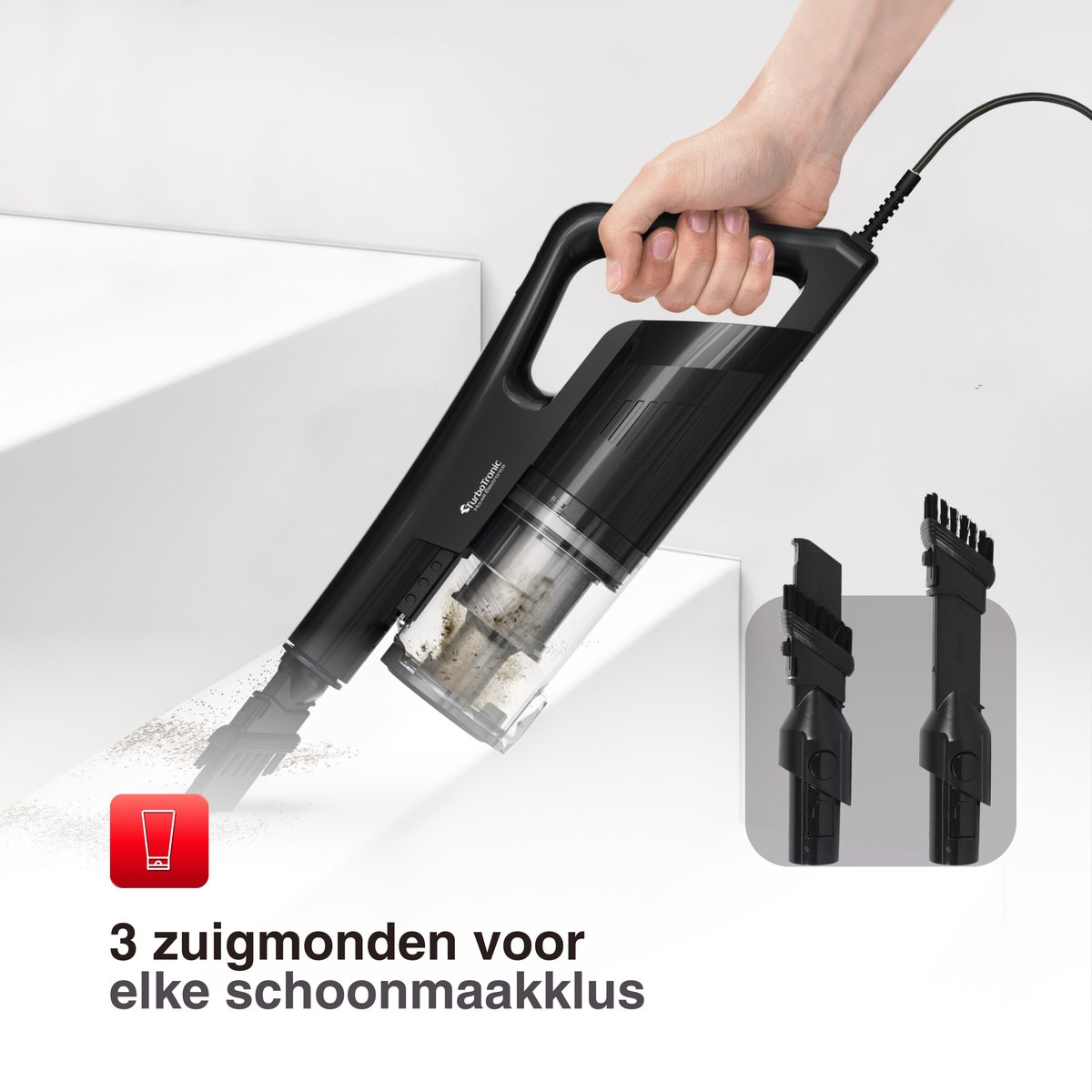 - Bereik kieren en plinten, 2‑in‑1 spleetmondstuk met uitschuifbare borstel.