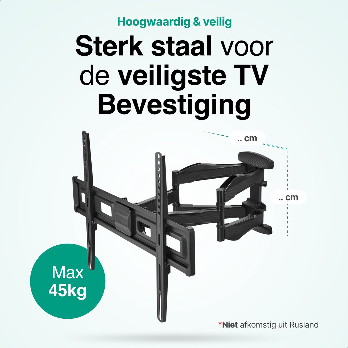 De beugel ondersteunt tot 45 kg en heeft meerdere VESA-maten, een uitschuifbaar schaarmechanisme en meegeleverde bevestigingsmaterialen inclusief waterpas. In één zin: praktisch, stevig en geschikt voor de meeste standaard-tv’s dat binnen het gewicht- en VESA-bereik valt.