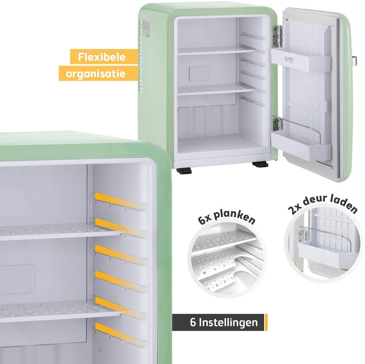 Voor stijlbewuste gebruikers is dit een fraaie aanvulling: het hoogglans retrodesign met metalen deurgreep past even goed in een strak interieur als in een speels ingerichte ruimte. Dankzij de verstelbare koeling (6–8 °C bij 25 °C omgeving) en de slimme indeling met zes legplanken en twee deurvakken benut je de compacte inhoud optimaal (bron: listing, gecontroleerd 2025).