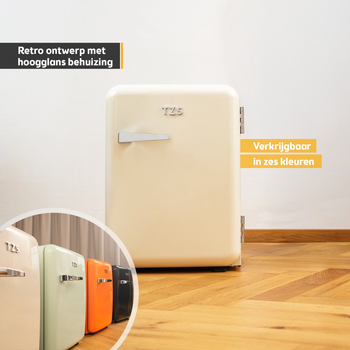 De TZS First Austria mini koelkast valt op door een retro-uitvoering met hoogglans front en een stevige metalen deurgreep. De behuizing is van metaal, het deurtje is van geschuimd kunststof. Je kunt kiezen uit meerdere kleuren (crème/rijstwit, zwart, oranje, lichtgroen, rood of blauw), zodat hij past bij uiteenlopende interieurs: Scandinavisch licht, speels en kleurrijk, of juist industrieel donker.