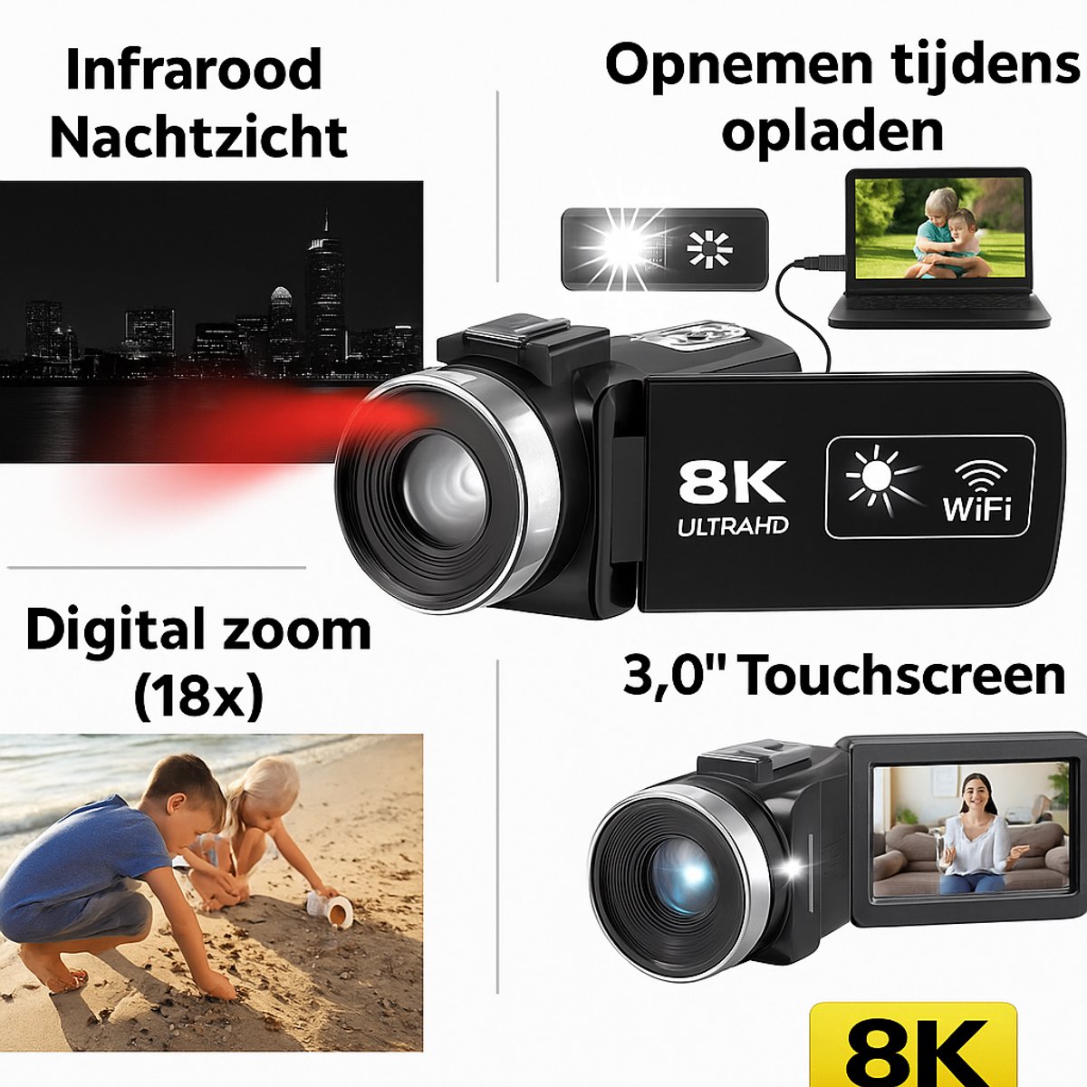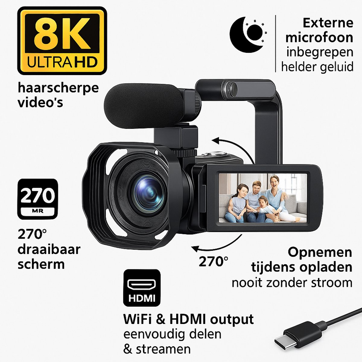 De 8K Ultra HD videocamera is een draagbare camcorder gericht op gebruikers die hoge resolutie en veel detail in hun opnamen willen. Het toestel combineert een hoge resolutie met een grote beeldsensor en een gebruiksvriendelijk aanraakscherm, waardoor zowel beginnende makers als gevorderde hobbyisten ermee uit de voeten kunnen.